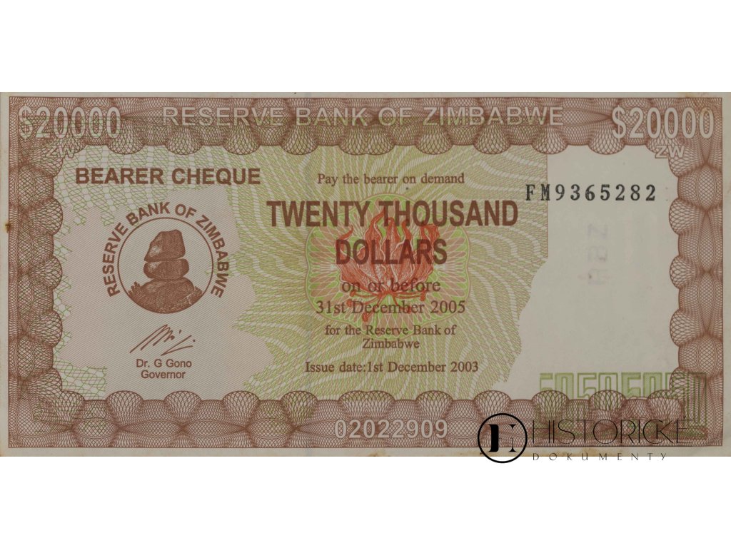 Šek na doručitele, anglicky Bearer Cheque, vydaný Reservní bankou Zimbabwe dne 1. prosince léta 2003, v hodnotě dvacet tisíc dolarů zimbabwských, s platností do 31. prosince 2005. Série FM 9365282, číslo 02022909. Podepsán guvernérem Dr. G. Gonem. Líc zdoben jest vyobrazením slavných balančních skal Chiremba, symbolu národního, i květem lilie plamenné v barvách oranžové a zelené. Zimbabwe trpělo v oné době hyperinflací počínající, kdy ceny rostly a platidla tištěna byla v hodnotách stále vyšších. Šeky tyto staly se předzvěstí úpadku hospodářského za vlády prezidenta Mugabeho. Stav zachovalosti velmi dobrý. Kuriozita numismatická pro sběratele.