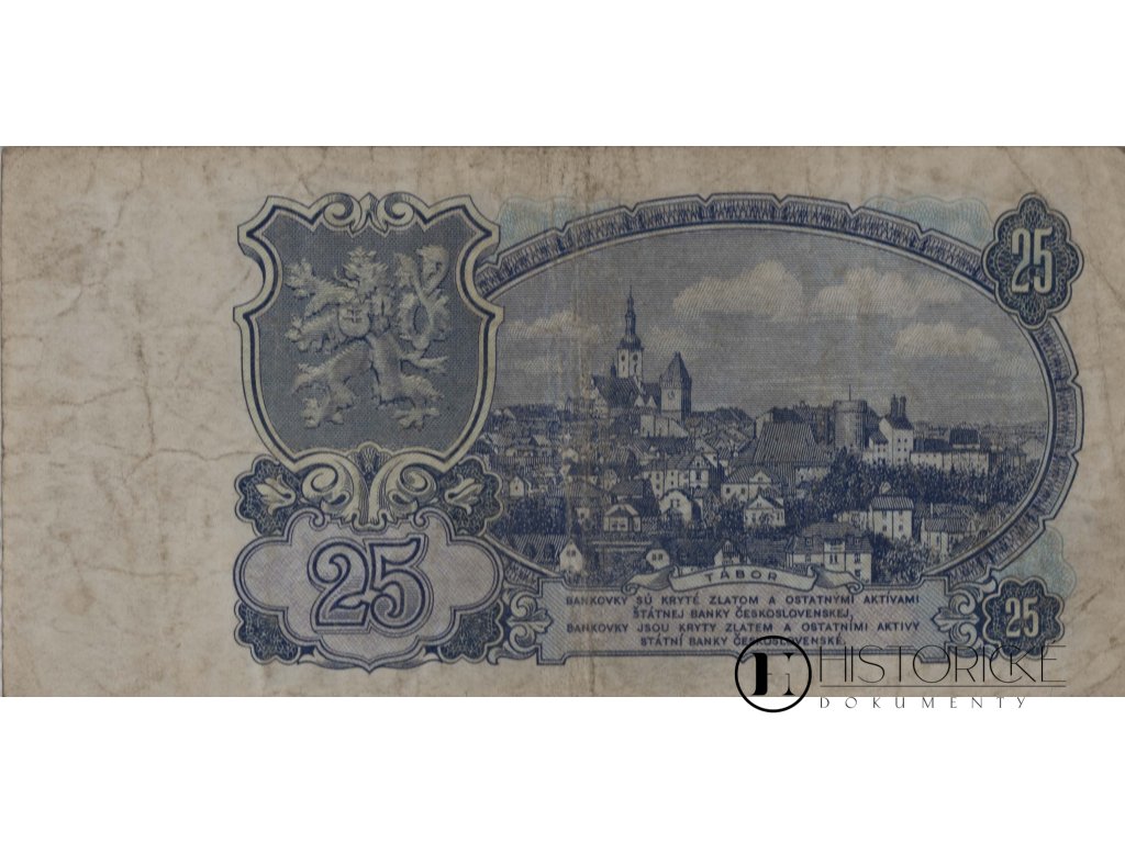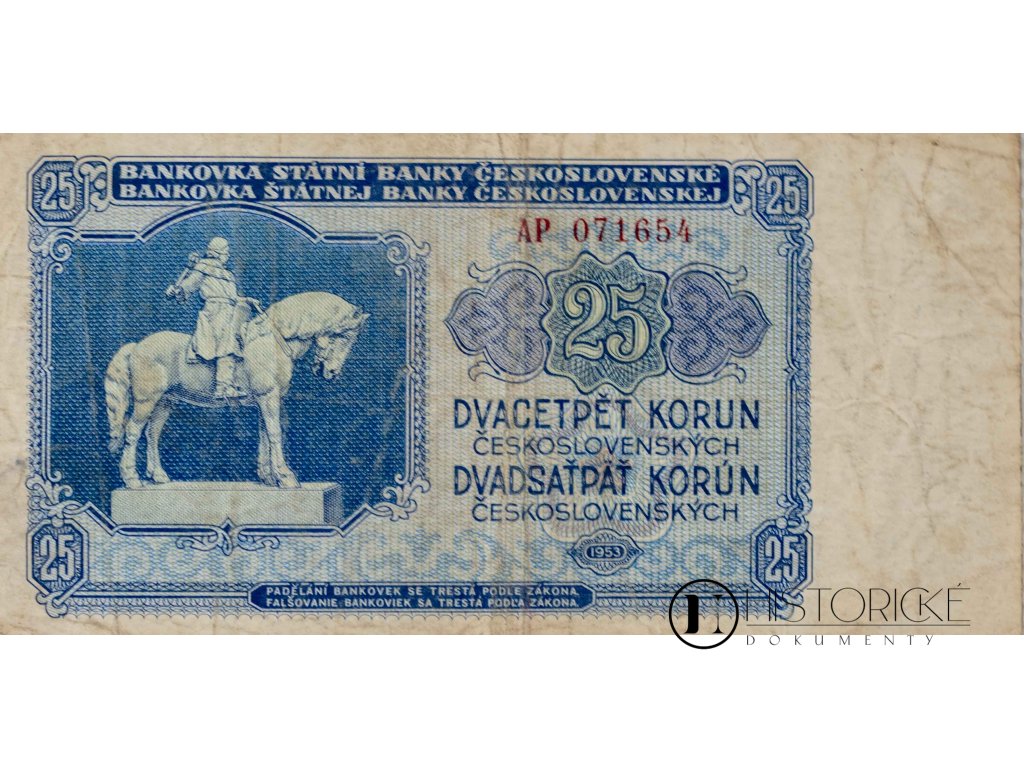 Bankovka v hodnotě 25 korun československých, série AP, č: 071654, léta Páně 1953 vydaná, dílo umělce Sergeje Akimoviče Pomanského ofsetovou technikou tištěné. Jest to platidlo z období měnové reformy, v oběhu od 1. června 1953 do 31. prosince 1962 jsoucí. Artefakt tento poskytuje vzácné svědectví o měnových poměrech doby socialistické a umění bankovkovém sovětském.