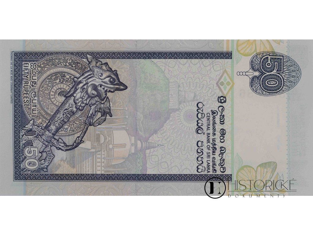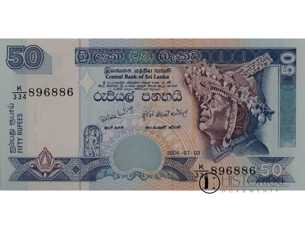 Předkládáme vzácnou bankovku z dalekého ostrova Ceylon, jenž nyní Srí Lankou slove, v hodnotě padesáti rupií. Papírové platidlo vydáno bylo Ústřední bankou srílanskou dne 3. července léta Páně 2006, série K/334, čísla 896886. Líc zdobí podobizna tanečníka v slavnostním úboru královského dvora kandyjského s nádhernou čelenkou, jakož i květ lotosu posvátného. Na rubu spatřiti lze bájného Makaru, tvora ochranného, i věž hodinovou v Colombu. Stav zachovalosti jest výtečný, barvy živé, bez poskvrny. Vzácný kousek pro každého milovníka platidel orientálních a numismatiky zámořské.