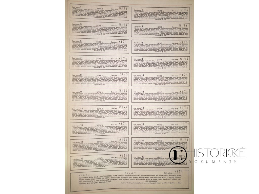 Cenný papír – akcie v nominální hodnotě 500 korun, vydaná Českou obchodní společností výrobců jabloneckého zboží dne 31. prosince léta Páně 1920. Opatřena unikátním číslem 8174, razítkem společnosti a vlastnoručním podpisem ředitele. K listině připojeno jest 20 kuponů k vyplacení dividend opravňujících. Dokument o třech listech, dokonale zachovalý. Artefakt vzácný, o rozkvětu průmyslu sklářského v mladé republice Československé svědčící.