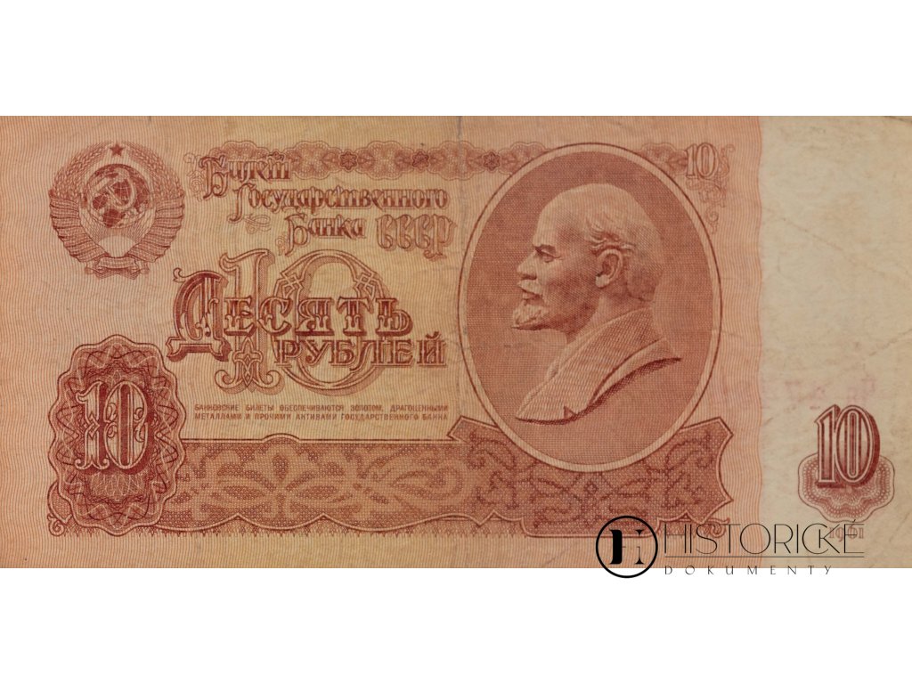 Bankovka Státní banky SSSR v hodnotě 10 rublů z roku 1961. Přední strana obsahuje oválný portrét V. I. Lenina, státní znak SSSR s 15 stuhami a nápis „Bankovky jsou zajištěny zlatem, drahými kovy a jinými aktivy Státní banky". Pozadí přechází z růžové do světle žluté barvy. Autorem averzu je S. A. Pomanskij, portrét Lenina vytvořil N. A. Sokolov, rytectví provedla L. F. Majorova. Na zadní straně se nachází velká gilošovaná rozeta s číslem 10 a nominál ve 14 jazycích sovětských republik. Autorem reversu je I. I. Dubasov.