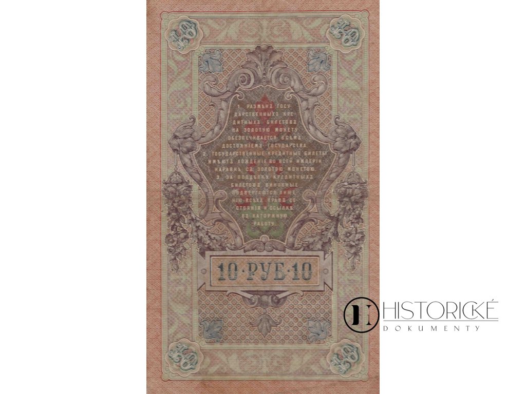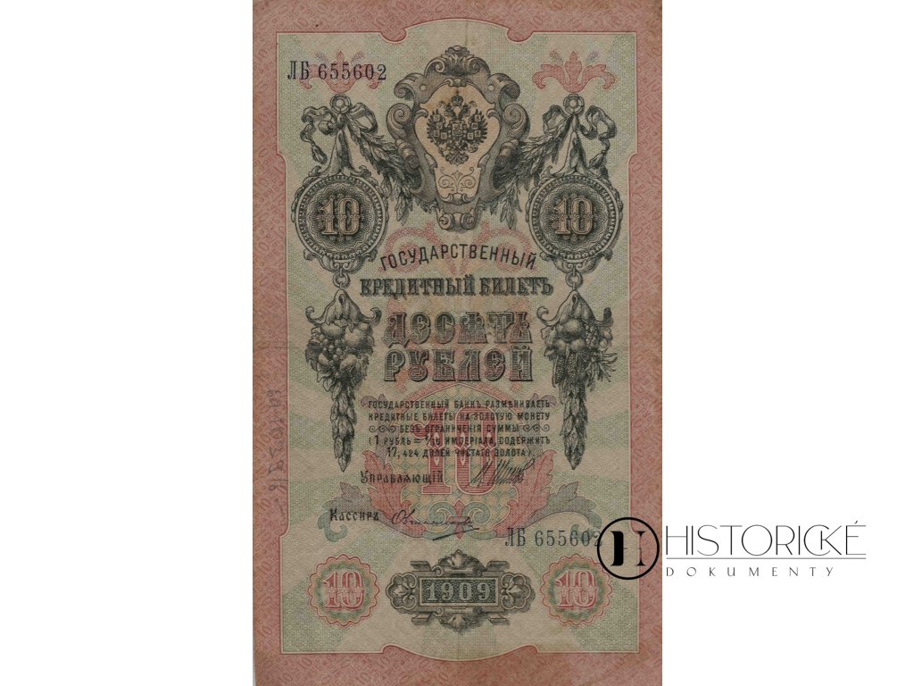 Carská bankovka v hodnotě 10 rublů z roku 1909, vydaná za vlády posledního ruského cara Mikuláše II. Tento numismatický artefakt, označený sériovým číslem 649385 a podpisy Timaševa a Afanasjeva (P.11a), představuje cenný doklad předrevolučního Ruska. Bankovka vyniká precizním tiskem a propracovaným designem typickým pro carské platidlo. Pro sběratele a historiky představuje vzácný dokument z období soumraku ruské monarchie a její měnové politiky.