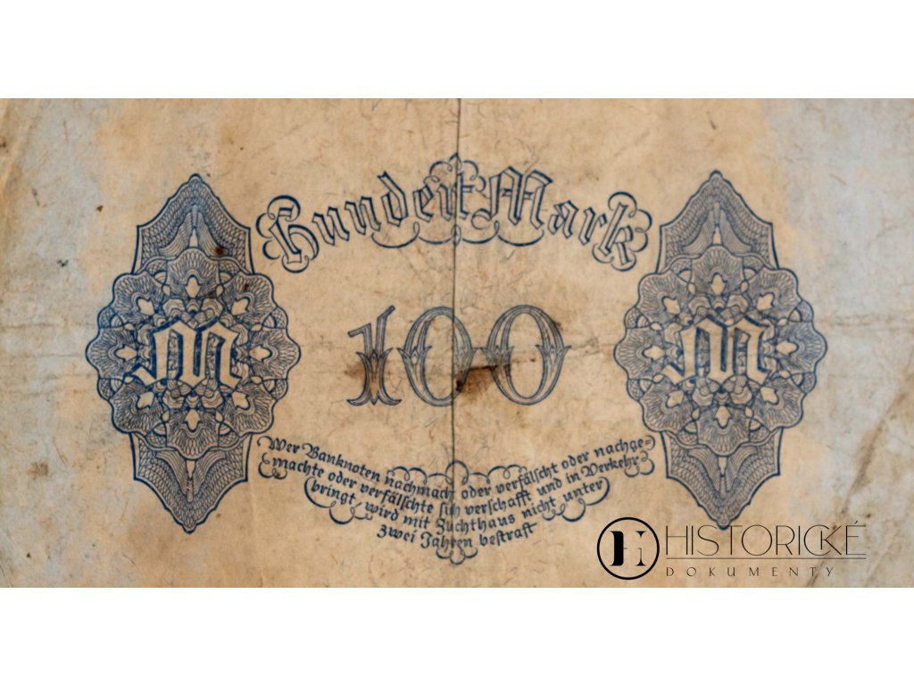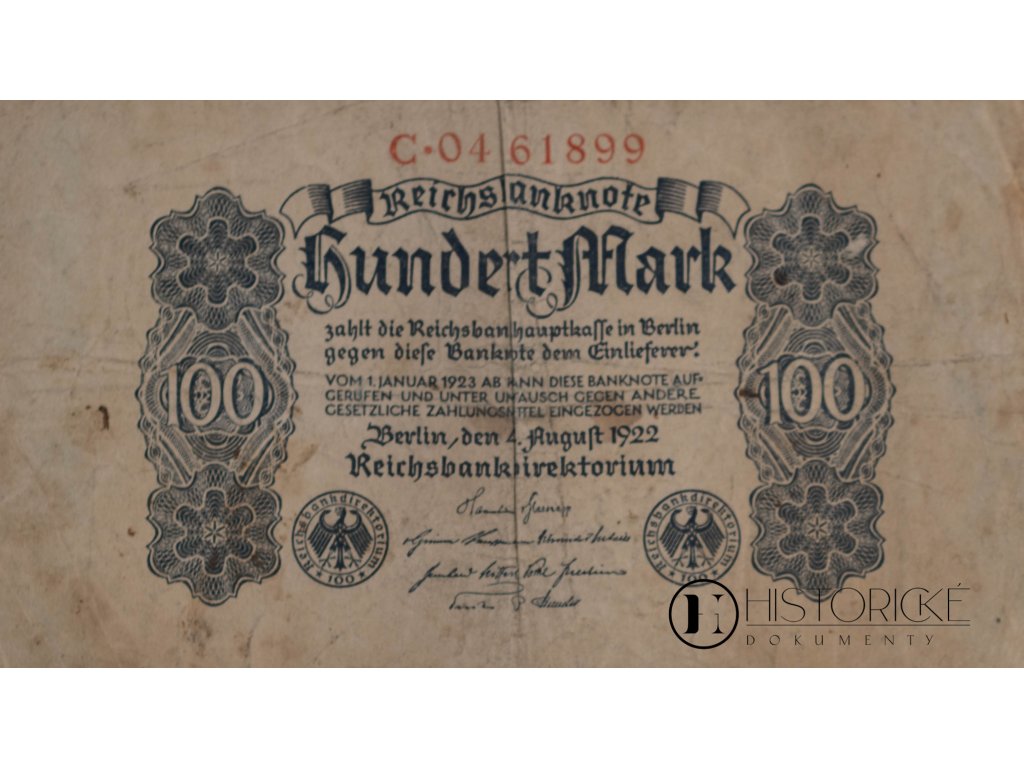 Tato bankovka 100 Mark z roku 1922, série C, je významným artefaktem z období Výmarské republiky v Německu. Vydaná v době narůstající inflace, odráží ekonomickou nestabilitu poválečného Německa. Denominace 100 Mark, kdysi značná suma, ilustruje rychlé znehodnocování měny. Design bankovky pravděpodobně kombinuje tradiční německé motivy s novými republikánskými symboly. Tento numismatický kus poskytuje fascinující vhled do turbulentního ekonomického a politického období mezi světovými válkami.