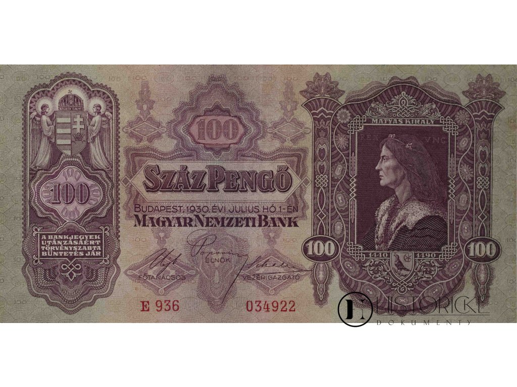 Maďarská bankovka v hodnotě 100 pengő vydaná Magyar Nemzeti Bank v roce 1930. Tento unikátní numismatický artefakt pochází z období Horthyho regentství a reprezentuje měnovou reformu, která zavedla pengő jako novou měnu. Bankovka vyniká charakteristickým uměleckým zpracováním a precizním tiskem typickým pro meziválečné období. Pro sběratele a historiky představuje cenný doklad o ekonomickém vývoji a měnové politice meziválečného Maďarska