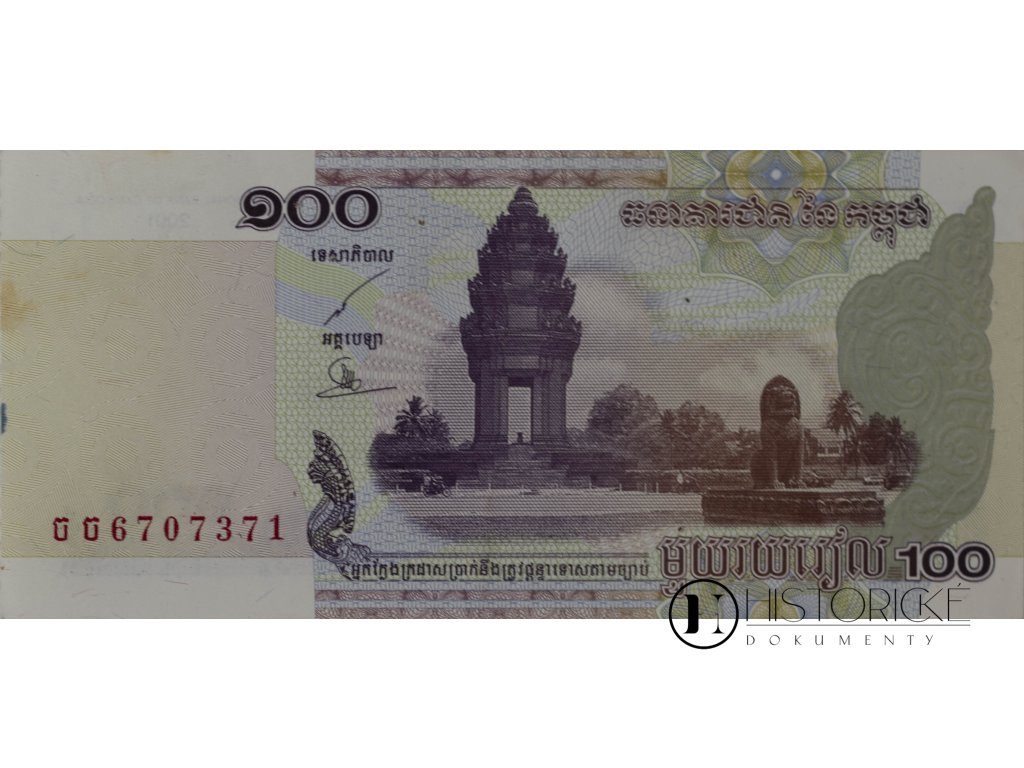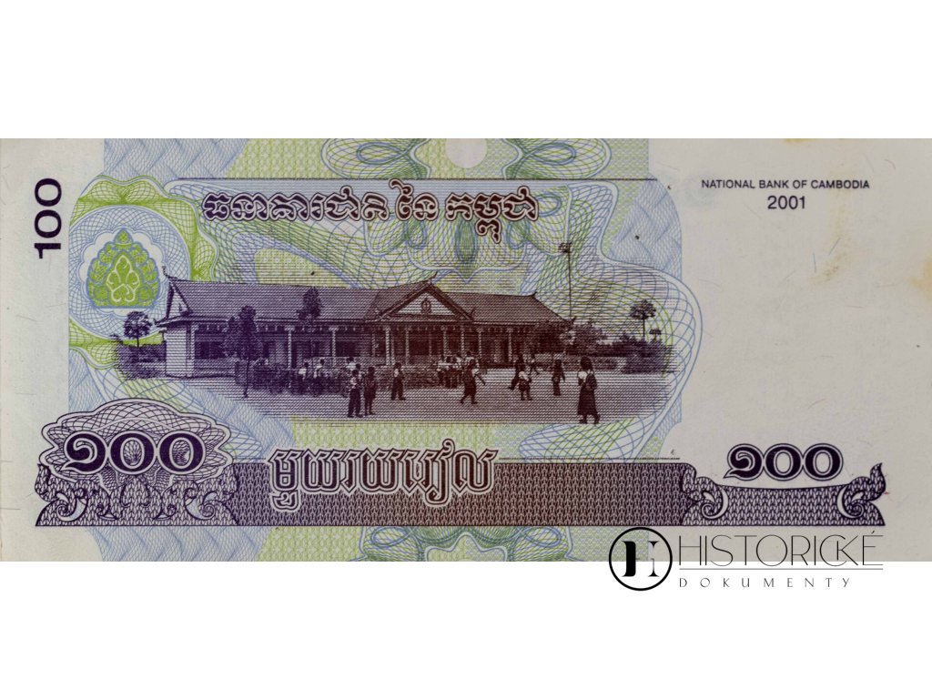 Na aversu zobrazena koloniální budova s lidmi v tradičních šatech, pravděpodobně významnou administrativní či vzdělávací instituci z francouzského období. Rveres obsahuje Independence Monument (Vimean Ekareach) v Phnom Penhu s angkorskými chrámy v pozadí, symbolizujícími nezávislost země z roku 1953 a kulturní dědictví Khmerské říše. Bankovka kombinuje koloniální historii s národní hrdostí a představuje numismatický dokument moderní Kambodže. Zajímavá památka jihovýchodní asijské numismatiky zachycující kambodžskou architekturu a kulturní symboly.
