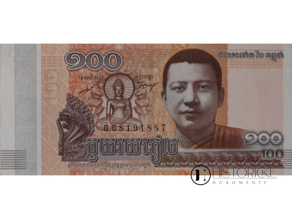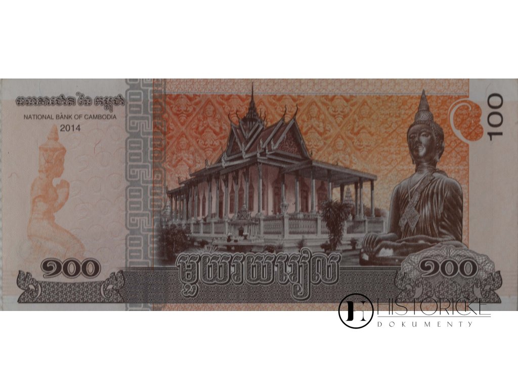 Na aversu zobrazen buddhistický mnich v oranžovém rouchu s Buddhou v pozadí a ornamentálním drakem. Revers obsahuje tradiční kambodžský chrám s typickou khmerskou architekturou a sochu Buddhy v meditační pozici. Bankovka představuje numismatický dokument moderní Kambodže s bohatou buddhistickou symbolikou a architektonickými památkami. Kombinuje náboženské motivy s kulturním dědictvím Angkorské říše. Zajímavá památka pro sběratele jihovýchodní asijské numismatiky zachycující kambodžskou buddhistickou tradici a khmerské umění.