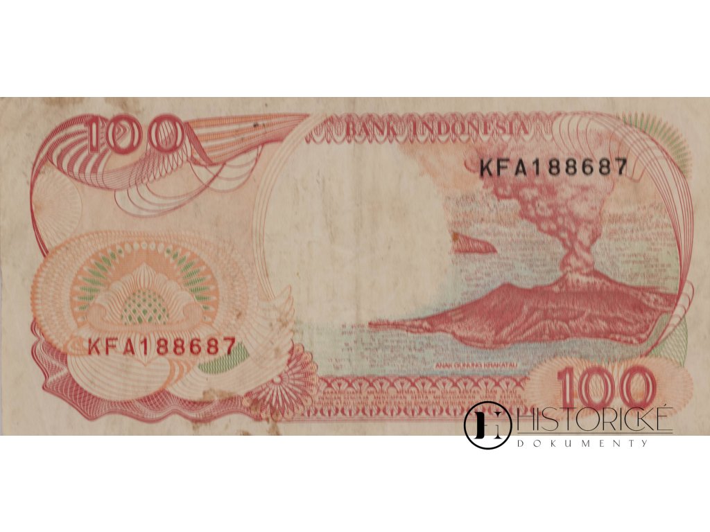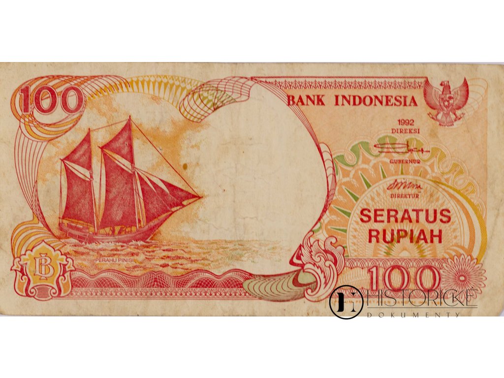 Bankovka indonéská v hodnotě 100 rupií z léta Páně 1992, vydaná Bankou Indonéskou státní. Číslo pořadové 188687 svědčí o pravosti kupury této. Stav zachovalosti není výtečný, ale uspokojivý. Bankovka zdobena jest vyobrazeními tradičními ostrovní říše indonéské, motivy kulturními i přírodními, jež připomínají bohatství země tisíců ostrovův. Platidlo z dob prezidenta Suharta, kdy rupie indonéská procházela proměnami významnými. Skvostný přírůstek do sbírek numismatických, zvláště pak sběratelův asijských valut.