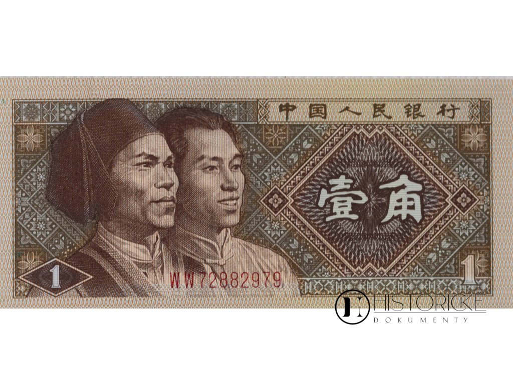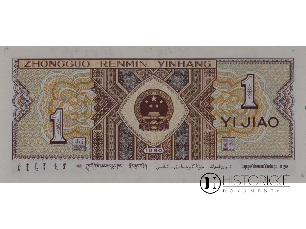 Na aversu portrét ženy a muže v kroji národním, představující dělnictvo a rolnictvo socialistické. Revers ozdoben státním znakem s pěti hvězdami a ornamentální rozetou. Text ve čtyřech jazycích národnostních menšin říše středu: mongolštině, tibetštině, ujgurštině a čuangštině svědčí o rozmanitosti etnické. Platidlo z dob reforem Teng Siao-pchingových, kdy Čína cestu k hospodářství tržnímu započala.