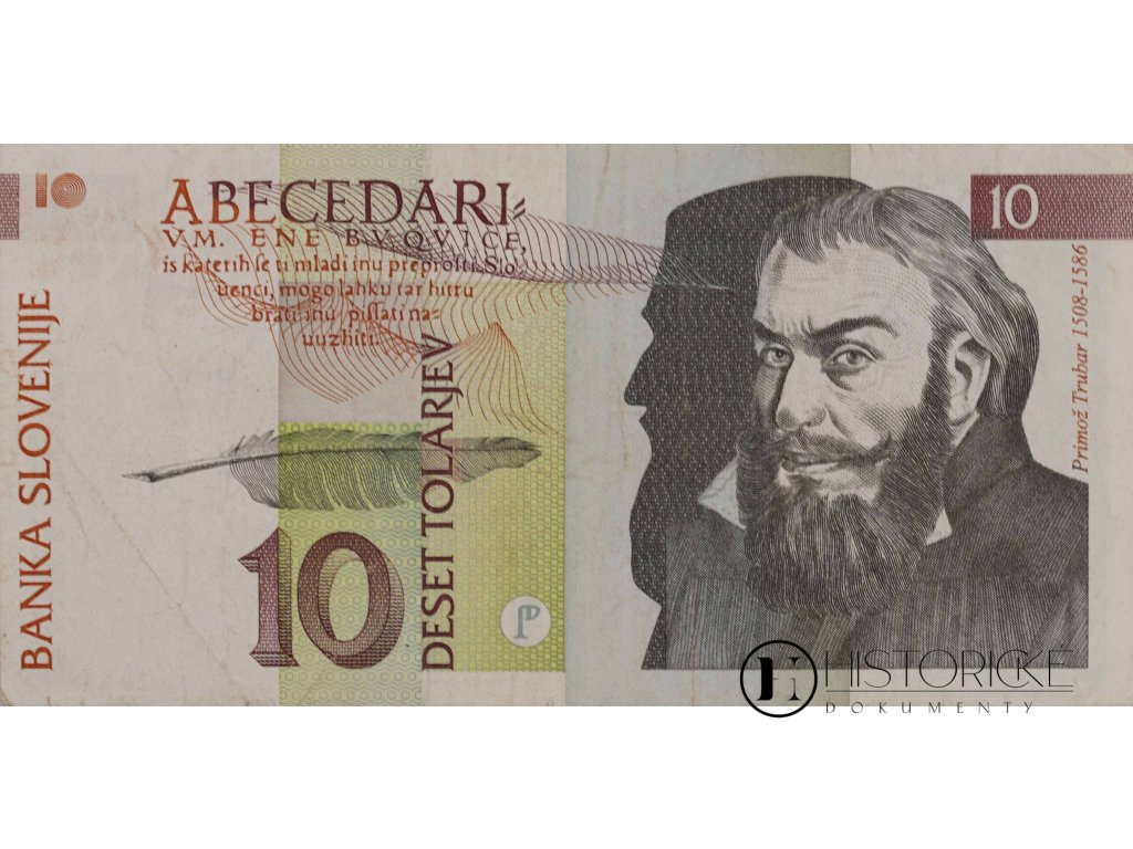 Avers zobrazuje Uršulinský kostel v Lublani a úryvek z Trubarova překladu Nového zákona Ta drugi deil tiga noviga testamenta. Revers nese portrét Primoža Trubara, otce slovinské literatury žijícího v letech 1508 až 1586, jenž vydal první tištěnou knihu ve slovinštině. Vedle portrétu vyobrazeno brko a ukázka z Trubarova Abecedáře. Tolar zaveden byl roku 1991 po vyhlášení nezávislosti Slovinska a obíhal do přijetí eura roku 2007. Platidlo oslavuje kulturní dědictví slovinského národa a jeho cestu k samostatnosti. Bankovka zachována ve stavu dobrém, nese stopy běžného oběhu.
