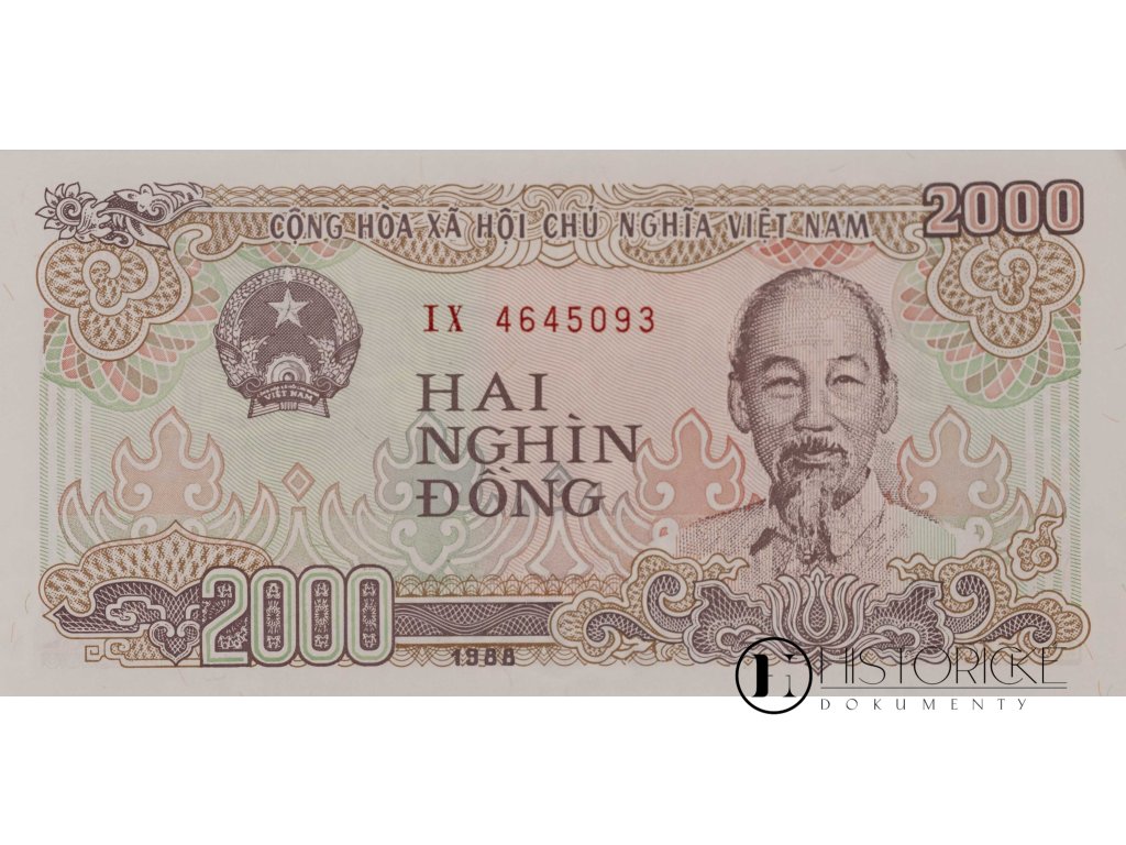 Papírové platidlo z Vietnamu socialistického, země to při moři Jihočínském, v hodnotě dvou tisíc dongů, vietnamsky Hai Nghìn Đồng, vydané Státní bankou vietnamskou léta 1988, série IX 4645093. Avers zdoben jest podobiznou Ho Či Mina, otce národa vietnamského, jenž zemi k nezávislosti dovedl, i znakem státním s hvězdou rudou. Ornamenty orientální v barvách pestrobarevných lemují okraje. Na reversuspatřiti lze výjev z továrny textilní, kdež dělnice u strojů přádelnických pracují, obraz to budování socialismu. Vietnam po válce dlouhé hospodářství své obnovoval. Stav zachovalosti výtečný. Vzácný kousek pro numismatiky i milovníky platidel asijských.