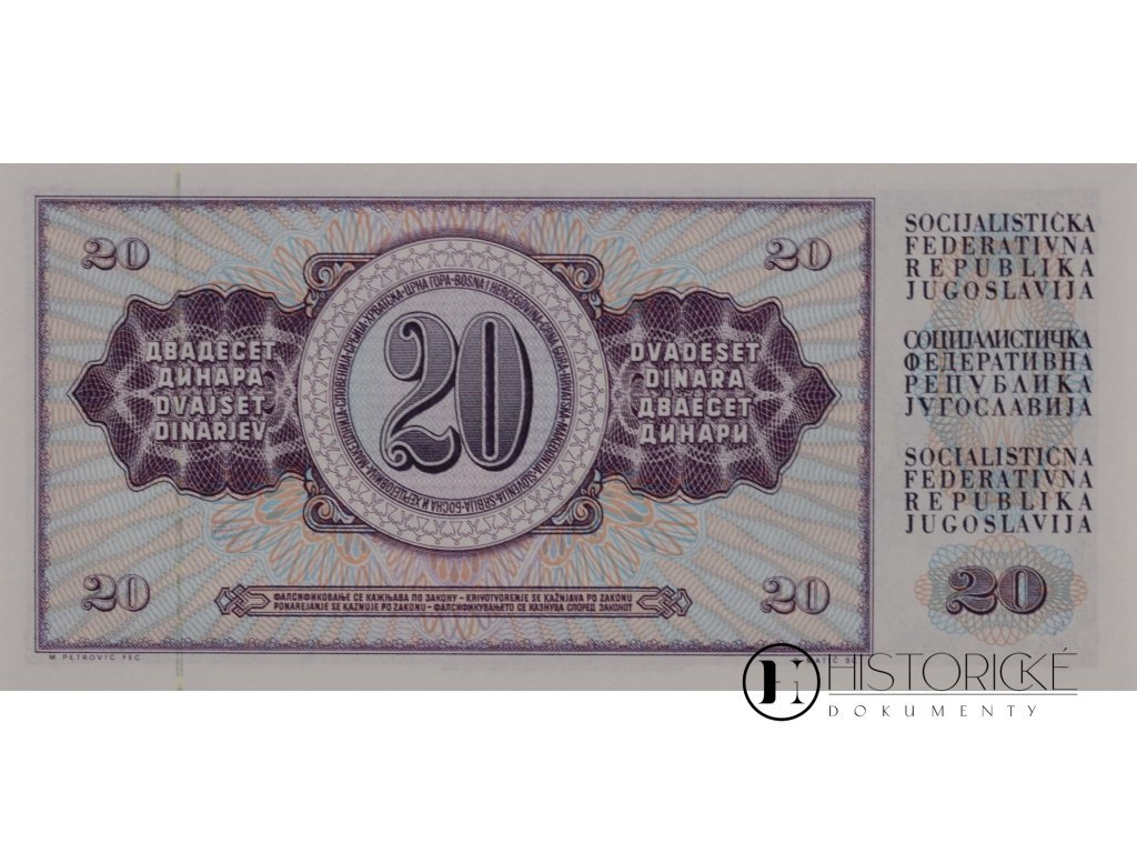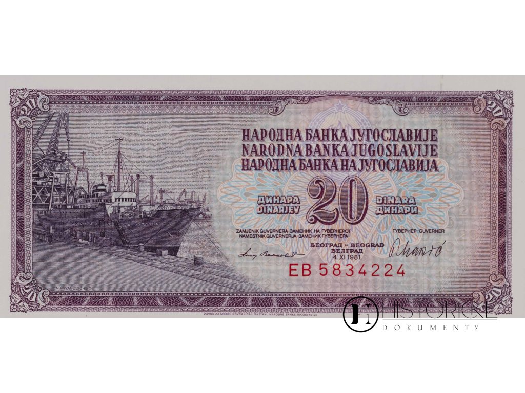 Jugoslávská bankovka v hodnotě dvaceti dinárů, vydaná Národní bankou Jugoslávie v Bělehradě dne 4. Listopadu léta Páně 1981. Platidlo nese sériové číslo GV 2070318 a jest dokladem měnového systému Socialistické federativní republiky Jugoslávie v období vlády maršála Tita. Tato bankovka představuje cenné svědectví o hospodářských poměrech balkánského socialistického státu v sedmdesátých letech.