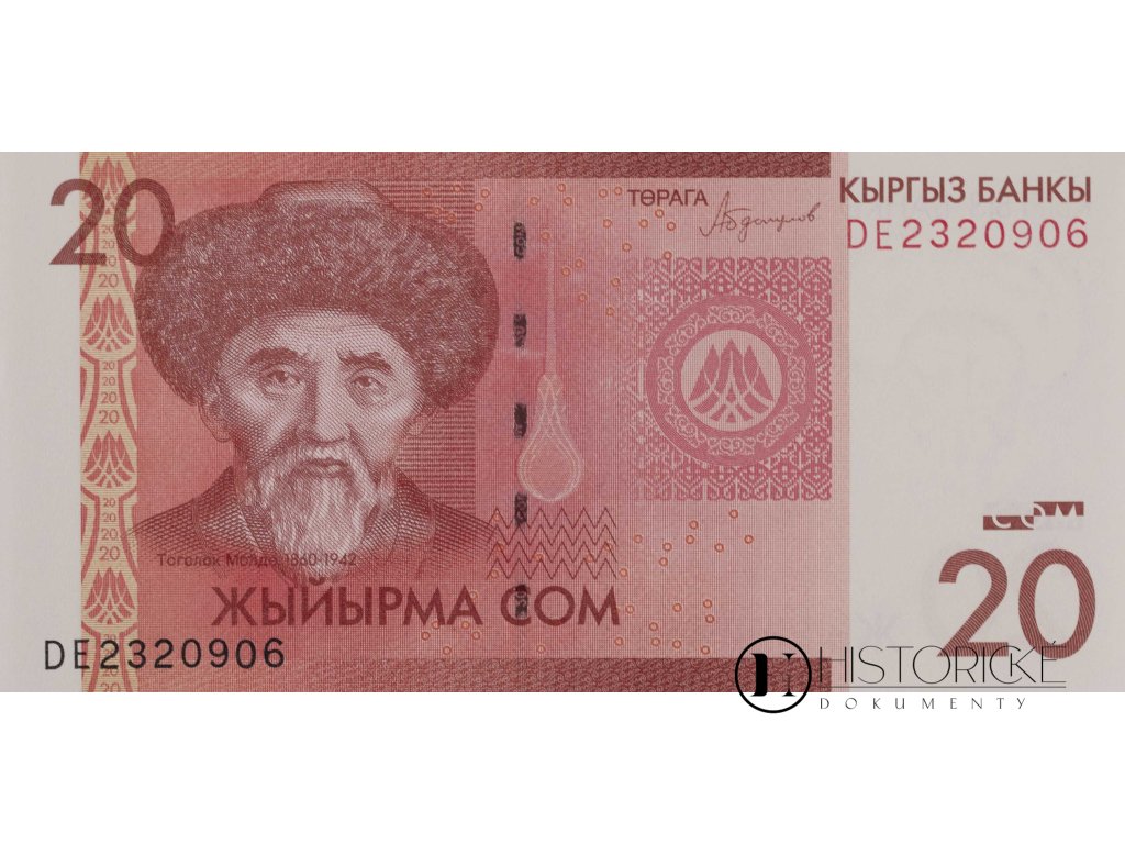 Avers zdoben jest podobiznou Togoloka Molda, básníka a vypravěče národního, jenž žil v letech 1860 až 1942 a eposy kyrgyzské uchovával. Na reversu spatřiti lze starobylou karavanseraj i štíty hor zasněžených, jimiž kdysi kupci po Hedvábné cestě putovali. Nápisy v jazyce kyrgyzském písmem cyrilským. Barva růžová a červená. Stav zachovalosti výtečný. Zajímavý kousek pro numismatiky i milovníky platidel středoasijských zemí.