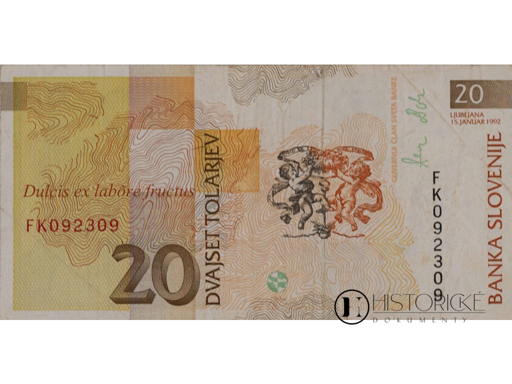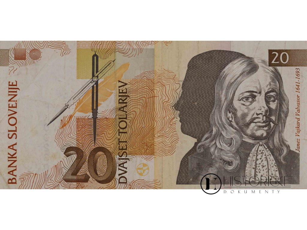 Bankovka Banky Slovinska v hodnotě 20 tolarjev, vydaná v Lublani dne 15. ledna 1992. Sériové číslo FK 092309. Avers zobrazuje portréta Janeze Vajkarda Valvasora, polyhistora a kronikáře žijícího v letech 1641 až 1693, autora monumentálního díla Sláva vévodství Kraňského. Vedle portrétu vyobrazeno kružidlo a brko, nástroje učencovy. Revers nese latinský nápis Dulcis ex labore fructus, tedy Sladké jest ovoce práce, a alegorický výjev andílků s rohem hojnosti. Valvasor proslul mapováním slovinských zemí a popisem jeskyně Cerknica. Tolar obíhal od vyhlášení nezávislosti roku 1991 do přijetí eura roku 2007. Bankovka nese stopy běžného oběhu, zachovalost uspokojivá.