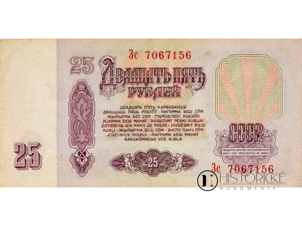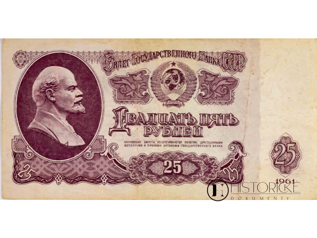 Bankovka v hodnotě 25 rublů, série bJa, léta Páně 1961 Státní bankou Sovětského svazu vydaná. Jest to platidlo nadmíru cenné, dokumentující měnové poměry v době vlády Chruščovovy. Artefakt tento poskytuje vzácné svědectví o hospodářství sovětském v době studené války a jest dokladem velezdařilým historie měnové východního bloku.