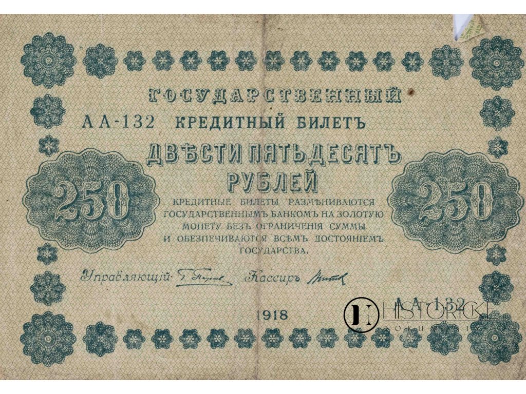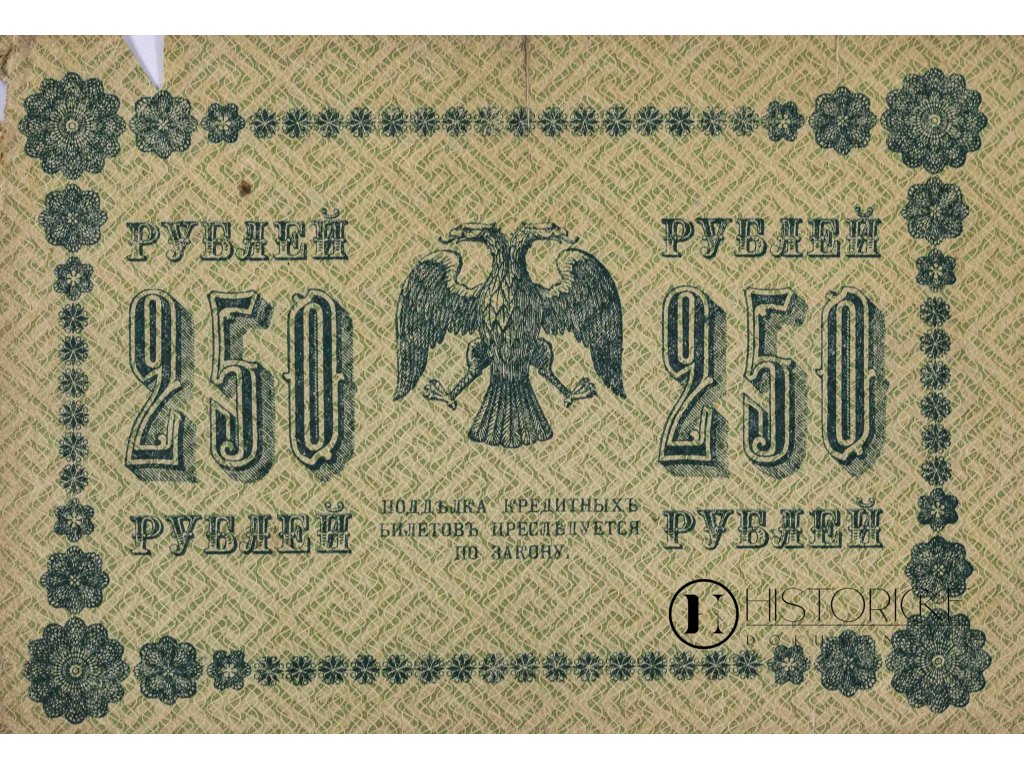 Vzácná ruská bankovka v hodnotě 250 rublů z roku 1918, známá jako "pjatakovka" podle podpisu komisaře G. Pjatakova. Návrh z dob Prozatímní vlády, emise započala v květnu 1919. Rytec Ivan Bilibin navrhl státní erb. Bankovka v tmavě a světle zelené barvě nese klasické carské symboly včetně dvouhlávého orla bez korun. Text slibuje výměnu za zlaté mince. Exemplář představuje přechodné období mezi carstvím a sovětskou mocí a jest cenným numismatickým dokladem revolučních let. Vzácný svědek měnových turbulencí ruských dějin počátku 20. století.