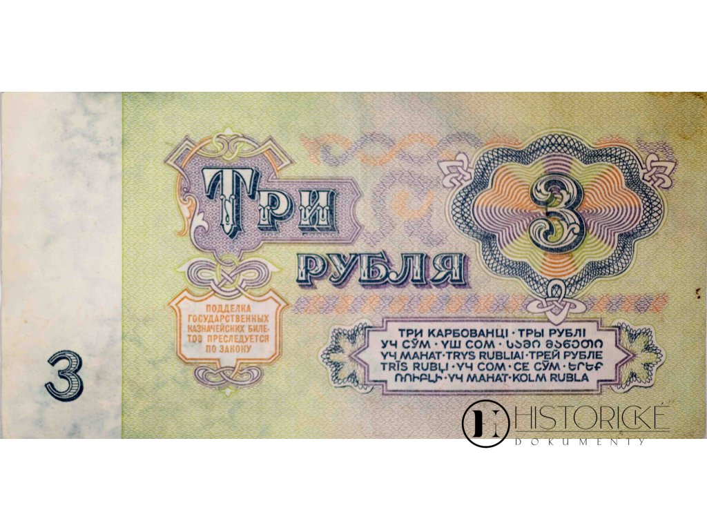Přední strana bankovky má vpravo úzké bílé pole, na němž je v dolní části v rámečku vyobrazena číslice „3“, zbytek plochy vyplňuje pozadí, které směrem ke středu plynule mění barvu ze salátové na světle šedou. Vpravo je pozadí ukončeno vlnovkou. Uprostřed je rytina zobrazující moskevský Kreml (Vodovzvodná věž, Velký kremelský palác, zvonice Ivana Velikého a několik kostelů). V horní části je vodorovný nápis - „Vstupenka do státní pokladny“, vpravo pod nápisem je vzor s písmeny „SSSR“. V pravé části je velká gilošovaná rozeta s číslicí „3“. Pod rytinou je nominál - „Tři ruble“, pod rámečkem se vzorem a číslicí „3“. Vlevo nahoře je znak SSSR vzoru 1956 s 15 stužkovými vazbami. Pod znakem je rámeček s textem v 8 řádcích: „Mezi dvěma pěticípými hvězdami je datum „1961“ a nápis: „STÁTNÍ KASAČNÍ LÍSTKY JSOU ZAJIŠTĚNY VŠEMI VLASTNICTVÍM Svazu SSSR A JSOU POVINNĚ PŘIJÍMÁNY NA CELÉM ÚZEMÍ SSSR PRO VŠECHNY PLATBY PRO VŠECHNY INSTITUCE, PODNIKY A OSOBY V NARUŠENÉ HODNOTĚ. V pravé části bankovky je červenou barvou vyznačena série a číslo. Autor averzu - S. A. Pomansky.