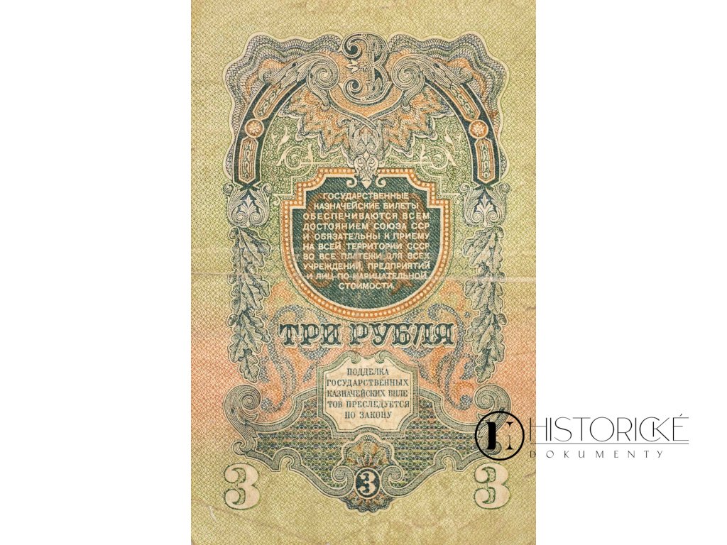 Státní pokladniční bilet SSSR v hodnotě 3 ruble z roku 1947. Autorem designu I. I. Dubasov. Bankovka má vertikální orientaci s využitím zelené, světle zelené, světle růžové, světle červené a červené barvy. Na lícové straně v horní části se nachází státní znak SSSR z roku 1956 s 15 svazky stuh symbolizujícími svazové republiky. Uprostřed dominuje velká číslice „3", pod níž je nominál uveden ve 14 jazycích SSSR. Na rubu je v ozdobném rámu nápis o zajištění bankovky veškerým majetkem SSSR a její platnosti.