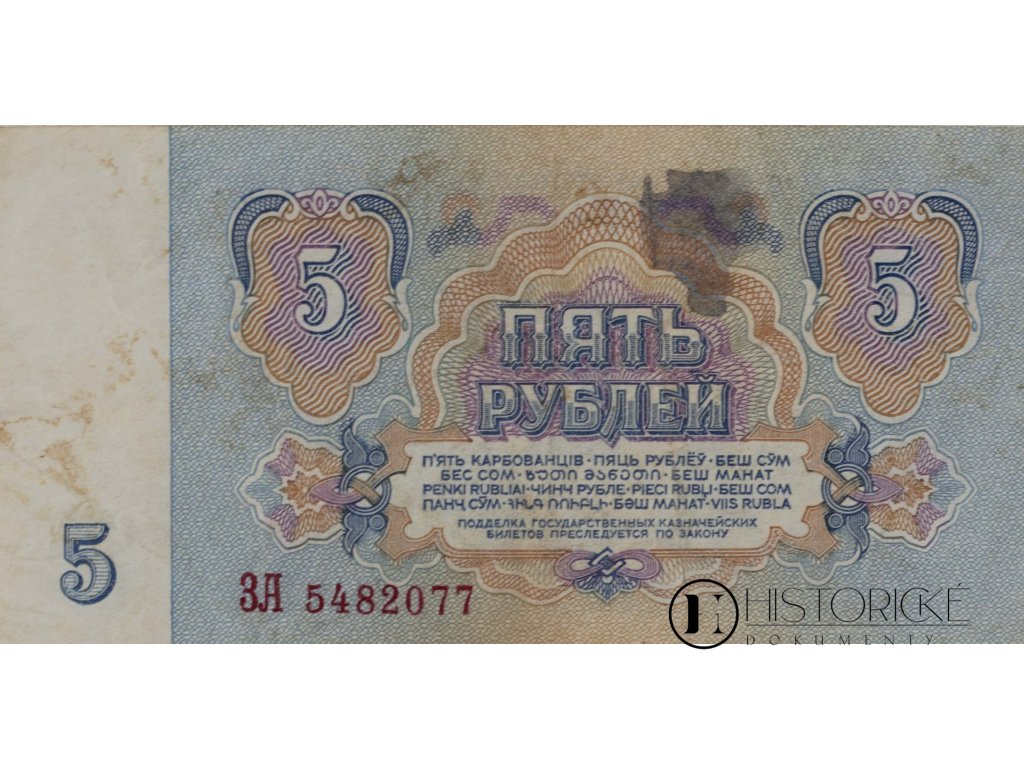 Bankovka v hodnotě 5 rublů, 3Д, číslo: 5482077, léta Páně 1961 Státní bankou Sovětského svazu vydaná. Jest to platidlo nadmíru cenné, dokumentující měnové poměry v době vlády Nikity Sergejeviče Chruščova. Artefakt tento poskytuje vzácné svědectví o hospodářství sovětském v době studené války a jest dokladem velezdařilým historie měnové východního bloku.