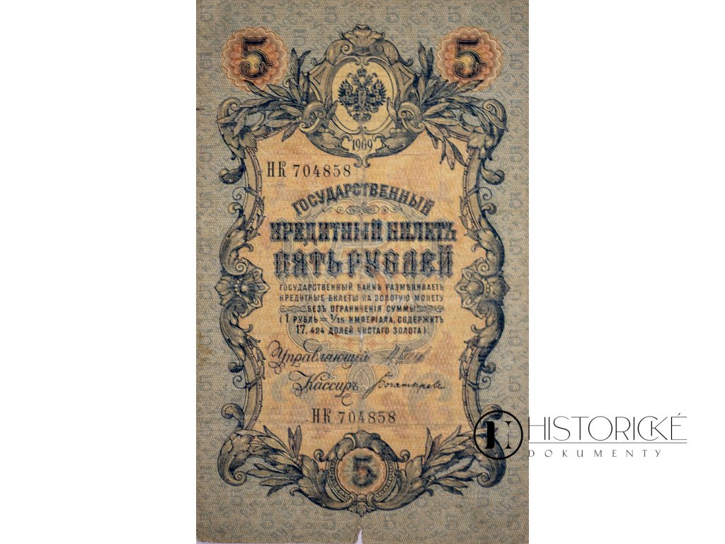Převelice vzácná bankovka pět rublů carského Ruska z roku 1909, série УА, nesoucí podpis I. Šipova. Tyto bankovky sérií УА-001 až УА-043 byly vydávány na podzim roku 1917, těsně před příchodem sovětské vlády. Tištěny byly v Expedici pro přípravu státních papírů v Petrohradu. Bankovka zůstala v oběhu od 1. prosince 1910 až do 8. září 1922, přežívajíc tři různá státní zřízení. Vyvedena v modré, světlemodré, oranžové a červené barvě. Na lícové straně stkví se státní znak Ruské říše s dvouhlavým orlem, na rubu pak císařská mantie s korunou a řádem sv. Ondřeje, pod níž spatřujeme říšské jablko a lví hlavu.