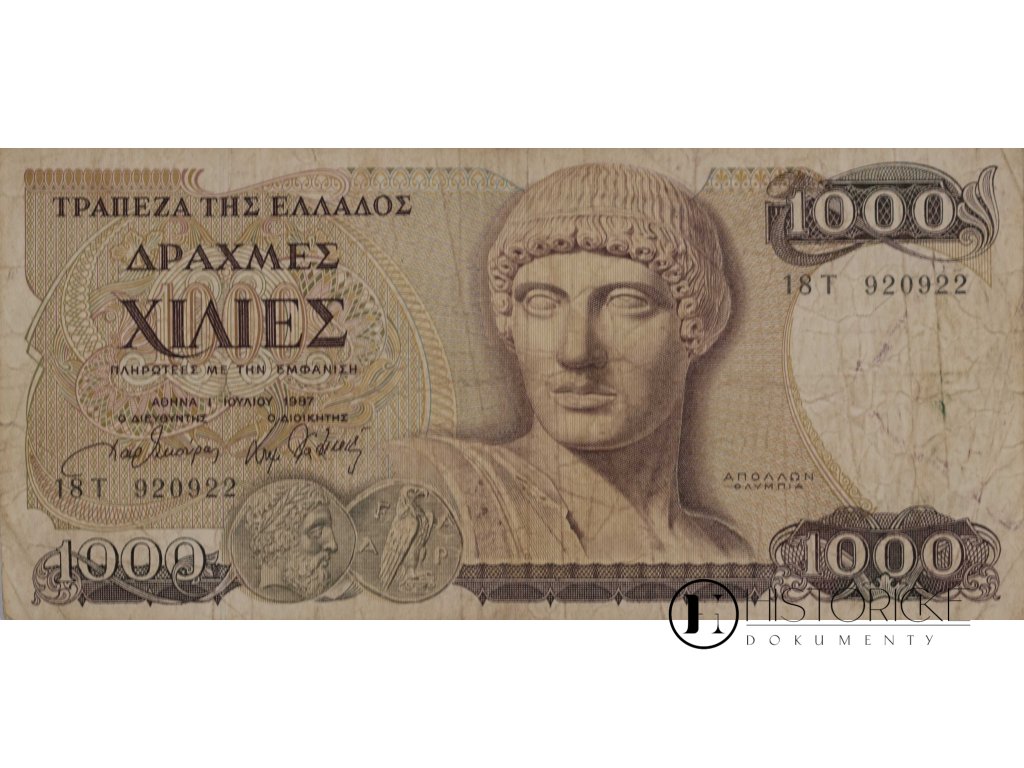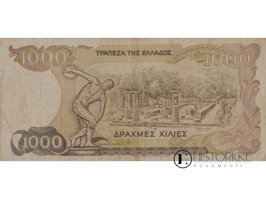 Papírové platidlo z Řecka, kolébky to civilizace evropské, v hodnotě jednoho tisíce drachem, řecky Δραχμές Χίλιες, vydané Bankou řeckou v Athénách dne 1. července léta 1987. Série 18 T 920922. Aver zdoben jest hlavou boha Apollóna z Olympie, božstva krásy a umění, v stylu antickém. Na reversuspatřiti lze slavného Diskobola Myrónova, sochu atleta disk vrhajícího, i zříceniny chrámu Héřina v Olympii posvátné, kdež hry olympijské se konaly. Ornamenty řecké v barvách teplých lemují okraje. Drachma, měna pradávná, Řecku sloužila až do příchodu eura. Stav oběhem poznamenaný. Vzácný kousek pro numismatiky i ctitele antiky.