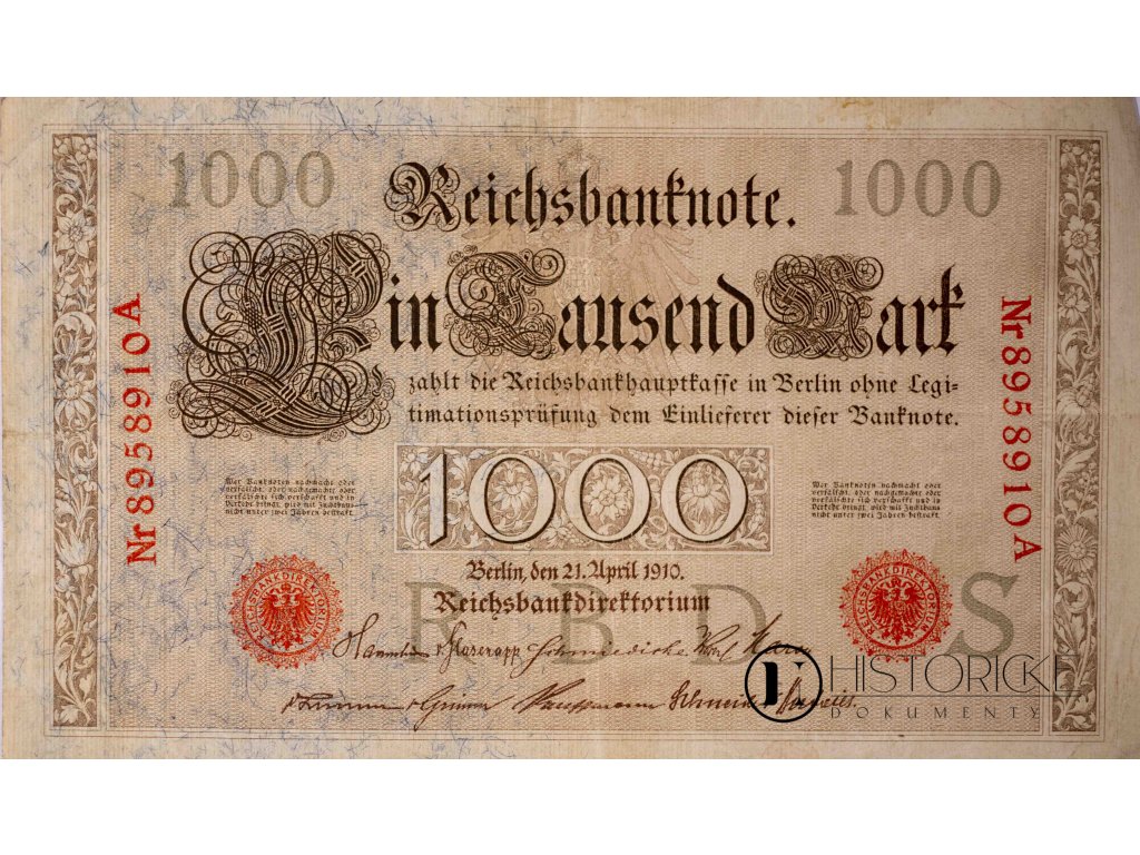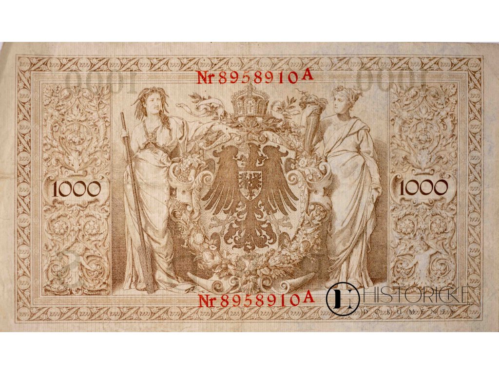 Bankovka 1 000 Mark z roku 1910 je krásným artefaktem německé monetární historie z období Německého císařství. Vydaná Říšskou bankou (Reichsbank) v éře před první světovou válkou, tato vysoká nominální hodnota odráží ekonomickou sílu a stabilitu wilhelmovského Německa. Bankovka pravděpodobně nese charakteristické prvky secesního designu, kombinující klasické motivy s moderními prvky. Její umělecké zpracování a ochranné prvky ilustrují vysokou úroveň německého tiskařského umění počátku 20. století