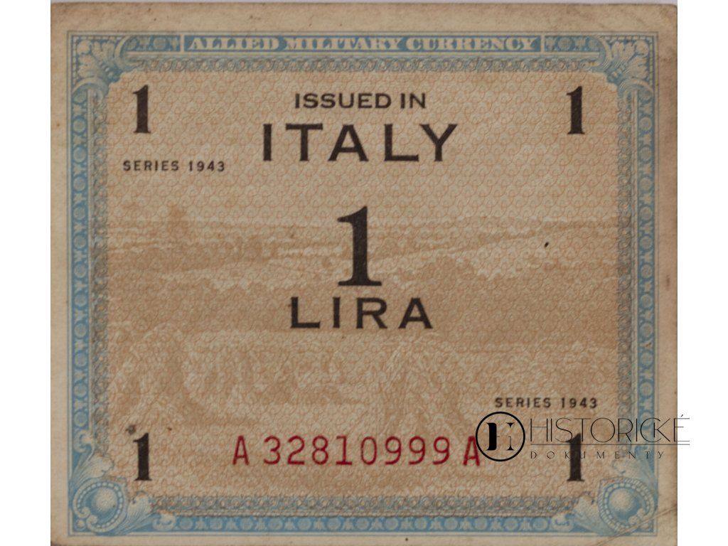 Na přední straně je modrý ozdobný okraj s nápisem Allied Military Currency; uprostřed bankovky je text Issued in Italy, 1 Lira a series 1943. Zadní strana bankovky má složitý modrý vzor s nápisem „Allied Military Currency“ uprostřed. V rozích vzoru jsou fráze „svoboda slova“, „svoboda náboženství“, „svoboda od nouze a svoboda od strachu.