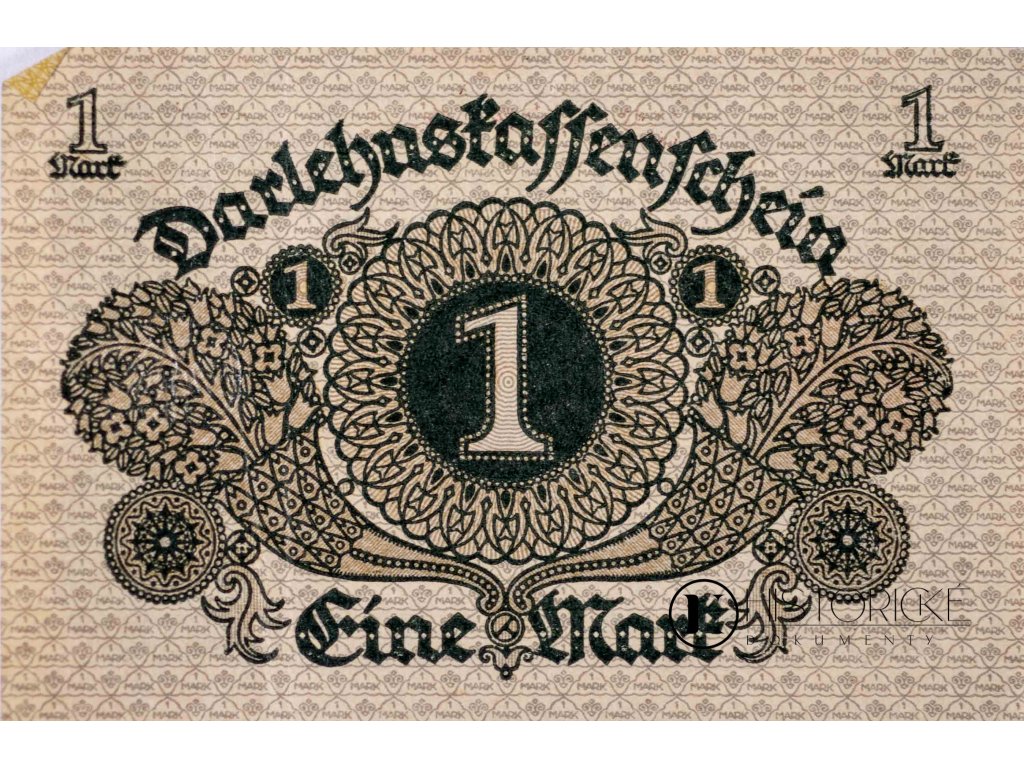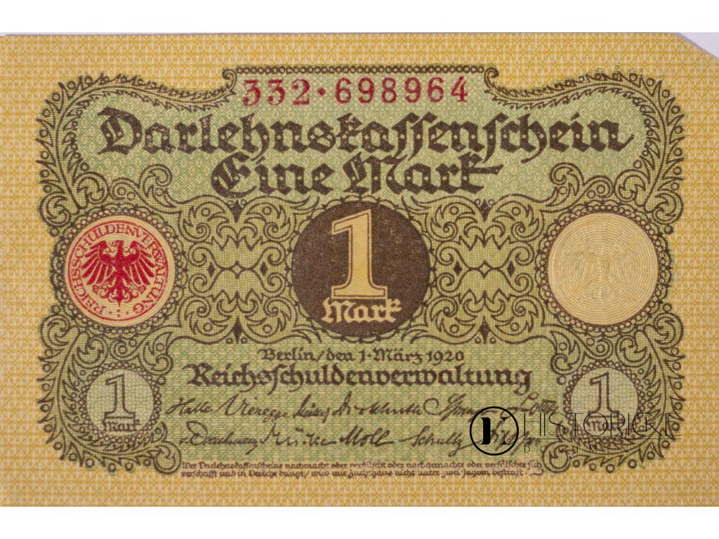Německá bankovka v hodnotě jedné marky vydaná Říšskou správou dluhů (Reichsschuldenverwaltung) v Berlíně dne 1. března léta Páně 1920. Bankovka nese sériové číslo 332-698964 a jest opatřena znakem říšského orla v červené barvě. Na rubu jest bohatá ornamentální výzdoba s centrálním motivem číslovky jedna. Představuje cenný doklad o poválečném měnovém systému Výmarské republiky.