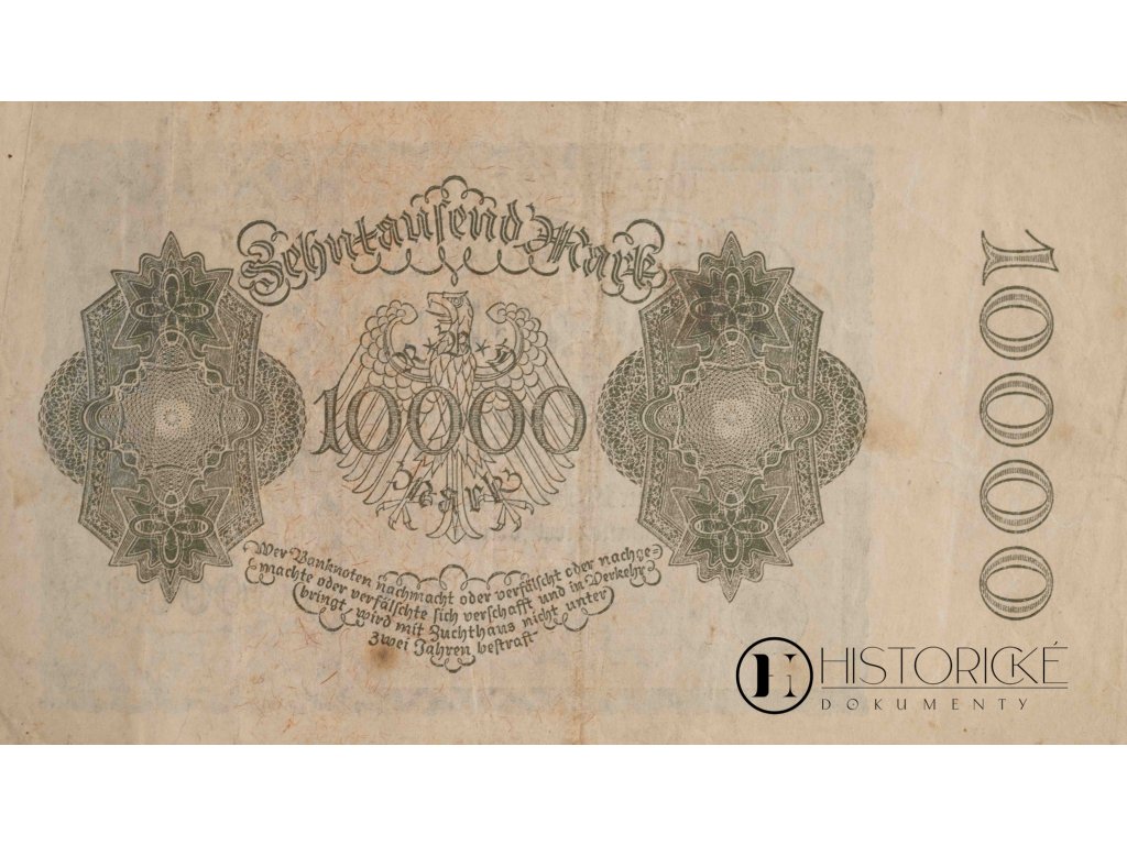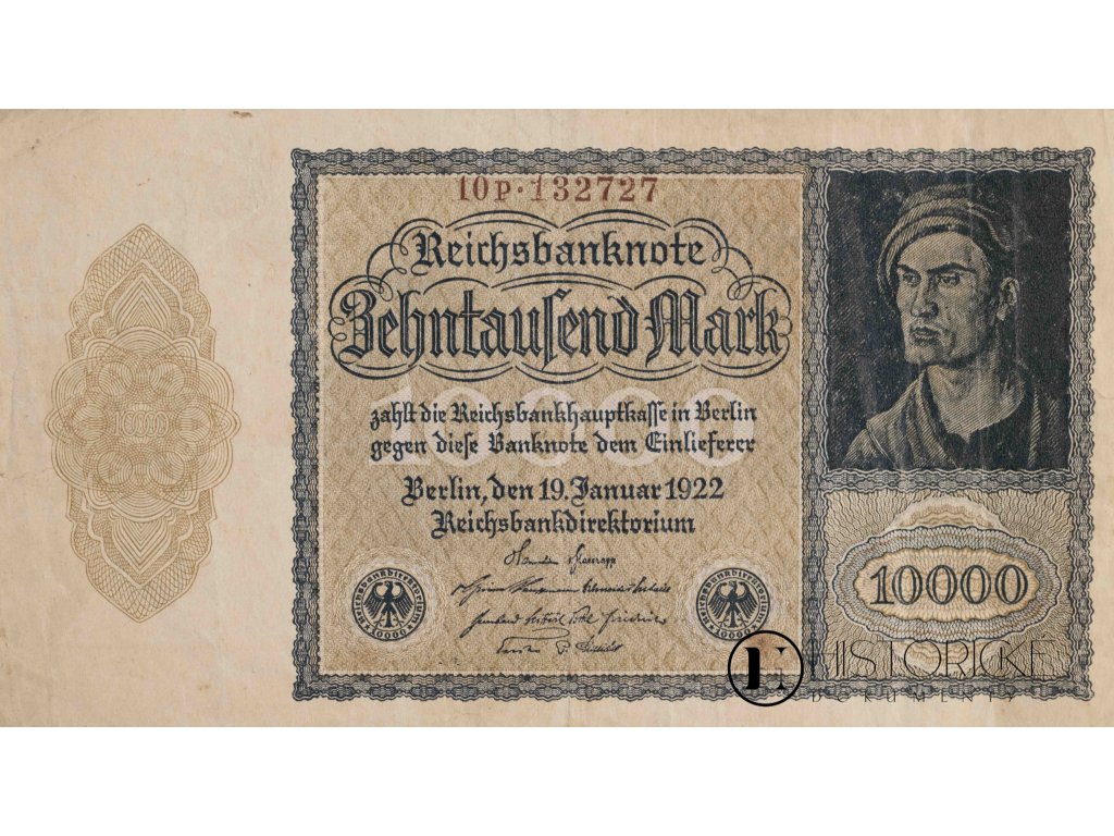 Tato bankovka 10 000 Mark z roku 1922 je výmluvným svědectvím dramatické hyperinflace, která zasáhla Německo v letech 1919-1924. Vydaná Německou říšskou bankou v období Výmarské republiky, reprezentuje zoufalou snahu udržet krok s rapidně rostoucími cenami. Nominální hodnota 100 Mark, kdysi značná suma, rychle ztrácela na hodnotě. Design bankovky pravděpodobně odráží napětí mezi tradičními motivy a modernistickými tendencemi, charakteristickými pro umělecké proudy Výmarské republiky.