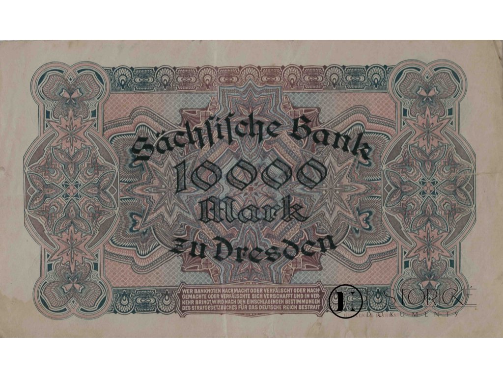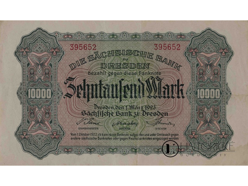 Soukromá bankovka saská v hodnotě 10.000 marek z Drážďan, vydaná roku 1923 v dobách inflace veliké. Číslo pořadové 395652 dokládá pravost kupury této z časův, kdy měna německá hrůzostrašným znehodnocením trpěla. Platnost od září 1922 do srpna 1923 svědčí o krátkém oběhu v období hyperinflace poválečné. Privatbanknote saská, v katalogu pod značkou SAX-13 vedená, představuje svědectví dob těžkých, kdy za bochník chleba miliony platiti bylo třeba. Památka numismatická vzácná z dob hospodářského chaosu výmarské republiky.