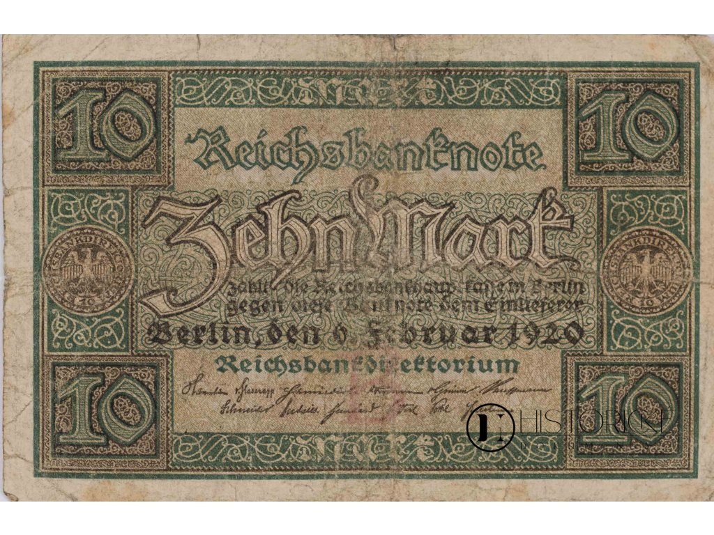 Bankovka Deutsche Reichsbank v hodnotě 10 marek z léta Páně 1920, pocházející z bouřlivých časů Výmarské republiky. Opatřena písmenem série M a číslem 6429094, jež její pravost dosvědčuje. Platnost svou podržela od prosince 1920 do 5. července 1925, kdy již inflace mírněji Německo sužovala. Exemplář vzácný, o pohnutých dobách poválečných svědčící, kdy republika německá na troskách císařství vznikala a s hospodářskými potížemi zápasila. Bankocetle dokonale zachovalá, zub času ji téměř nepoznamenal.