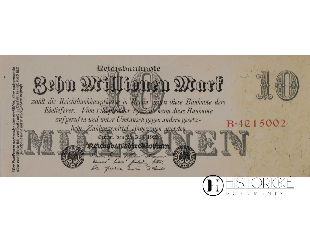 Tato bankovka 10 milionů marek, vydaná 1. září 1923, je dramatickým svědectvím o hyperinflaci ve Výmarské republice. Představuje vrchol inflační krize, kdy hodnota měny klesala téměř každou hodinu. Tyto bankovky s astronomicky vysokými nominálními hodnotami symbolizují ekonomický chaos a sociální nejistotu poválečného Německa. Přestože byla v oběhu jen krátce, je cenným historickým artefaktem, ilustrujícím jedno z nejdramatičtějších období moderních ekonomických dějin.