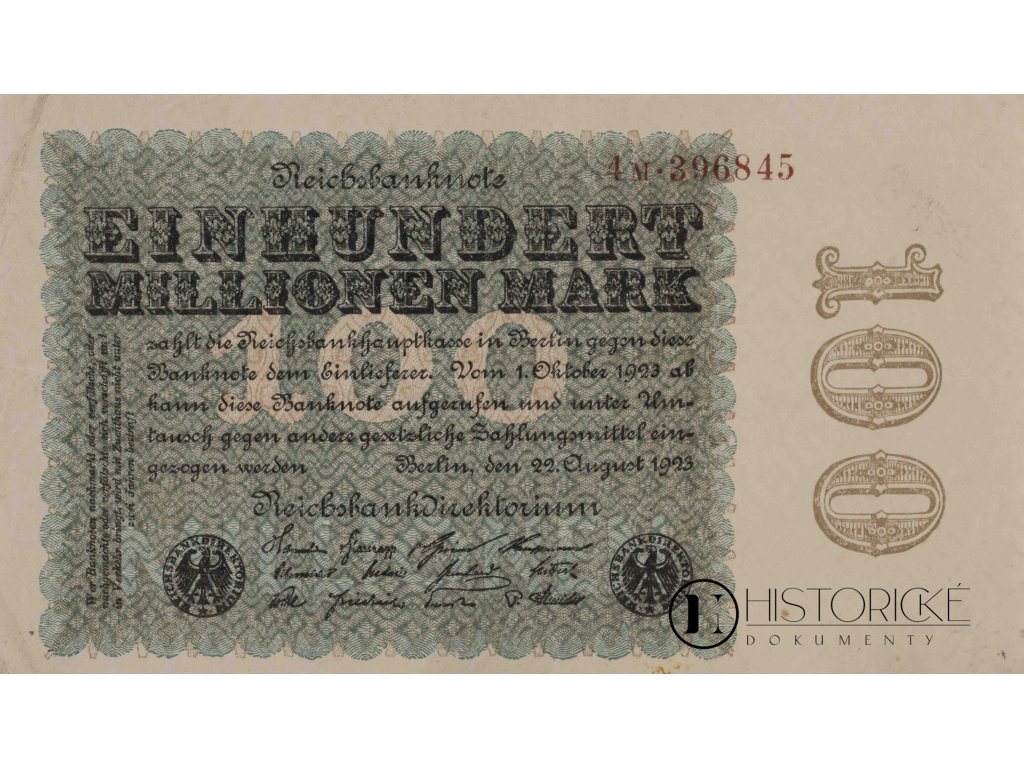 Historická německá bankovka sta milionů marek (100 Million Mark) vydaná Německou říšskou bankou (Deutsche Reichsbank) léta Páně 1923, série D, číslo 06649750. Tento vzácný platební prostředek pochází z nejhorší éry hyperinflace ve Weimarské republice (1918-1933), kdy hodnota marky padala každodenně do propasti a ceny rostly neuvěřitelnou rychlostí. Platnost měla od září 1923 do 5. července 1925. Bankovka katalogizována jest jako DEU 119, strana 101. Dokládá nejčernější hospodářskou krizi moderních dějin, kdy sto milionů marek stačilo sotva na chléb a lidé vozili peníze ve vozech. Tisk jednoduchý bez portrétu, pouze s astronomickou nominální hodnotou. Pro sběratele historických platidel představuje vzácné svědectví o úplném kolapsu měny, jenž vedl k sociálním otřesům a později k pádu demokracie.