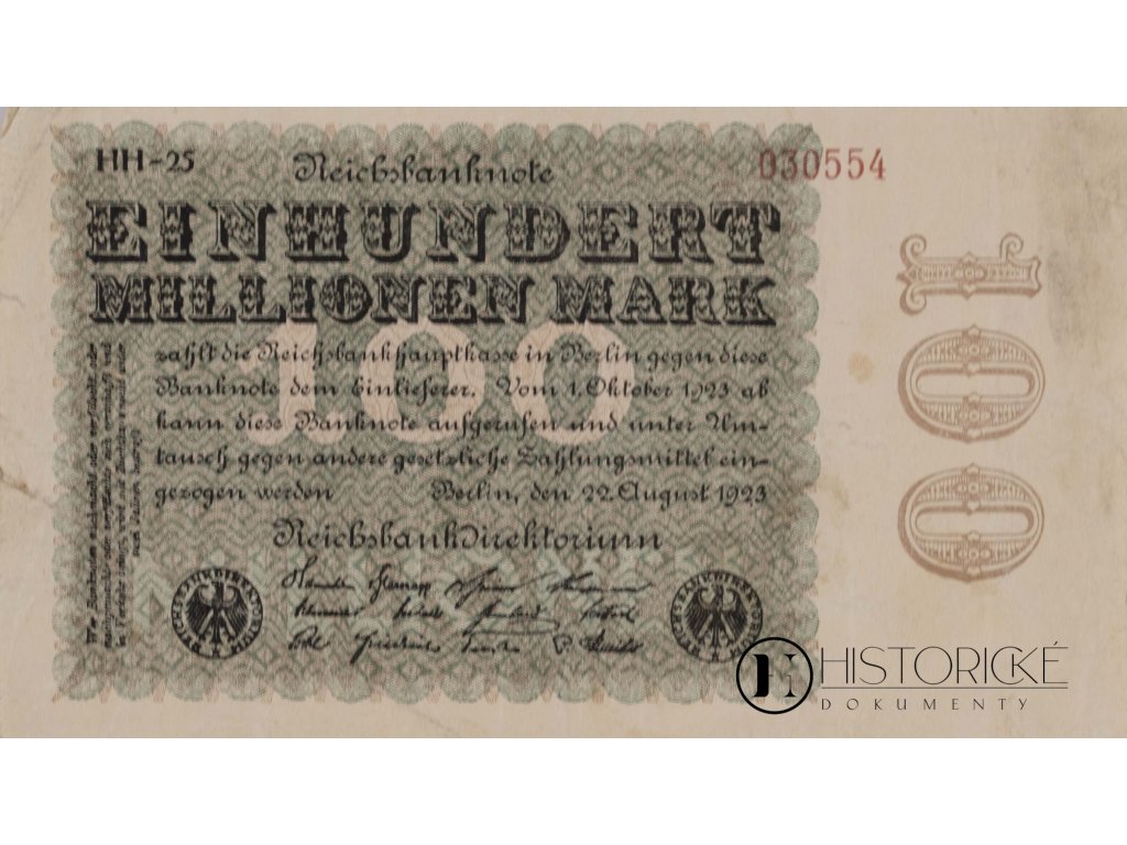 Historická německá bankovka sta milionů marek (100 Million Mark) vydaná Německou říšskou bankou (Deutsche Reichsbank) léta Páně 1923, série D, číslo 06649750. Tento vzácný platební prostředek pochází z nejhorší éry hyperinflace ve Weimarské republice (1918-1933), kdy hodnota marky padala každodenně do propasti a ceny rostly neuvěřitelnou rychlostí. Platnost měla od září 1923 do 5. července 1925. Bankovka katalogizována jest jako DEU 119, strana 101. Dokládá nejčernější hospodářskou krizi moderních dějin, kdy sto milionů marek stačilo sotva na chléb a lidé vozili peníze ve vozech. Tisk jednoduchý bez portrétu, pouze s astronomickou nominální hodnotou. Pro sběratele historických platidel představuje vzácné svědectví o úplném kolapsu měny, jenž vedl k sociálním otřesům a později k pádu demokracie.