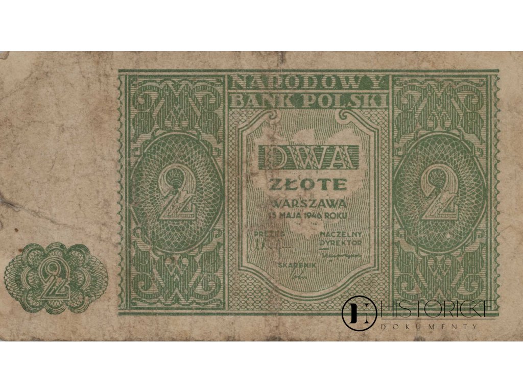 Aversni strana v barvě zelené nese nápis Narodowy Bank Polski, nominál Dwa Złote v ornamentálním rámci s giliošovými rozetami a podpisy prezesa, hlavního ředitele a pokladníka. Reversní strana zdobena centrální rozetou s nominální hodnotou a textem potvrzujícím, že bankovky Polské národní banky jsou zákonným platidlem v Polsku. Rok 1946 spadá do období poválečné obnovy Polska pod vládou komunistickou, kdy země procházela stabilizací měnovou po chaosu okupačním. Bankovka bez sériového čísla, tisk jednoduchý odpovídající nouzovým emisím. Platidlo nese výrazné stopy oběhu. Numismatický doklad poválečného Polska.