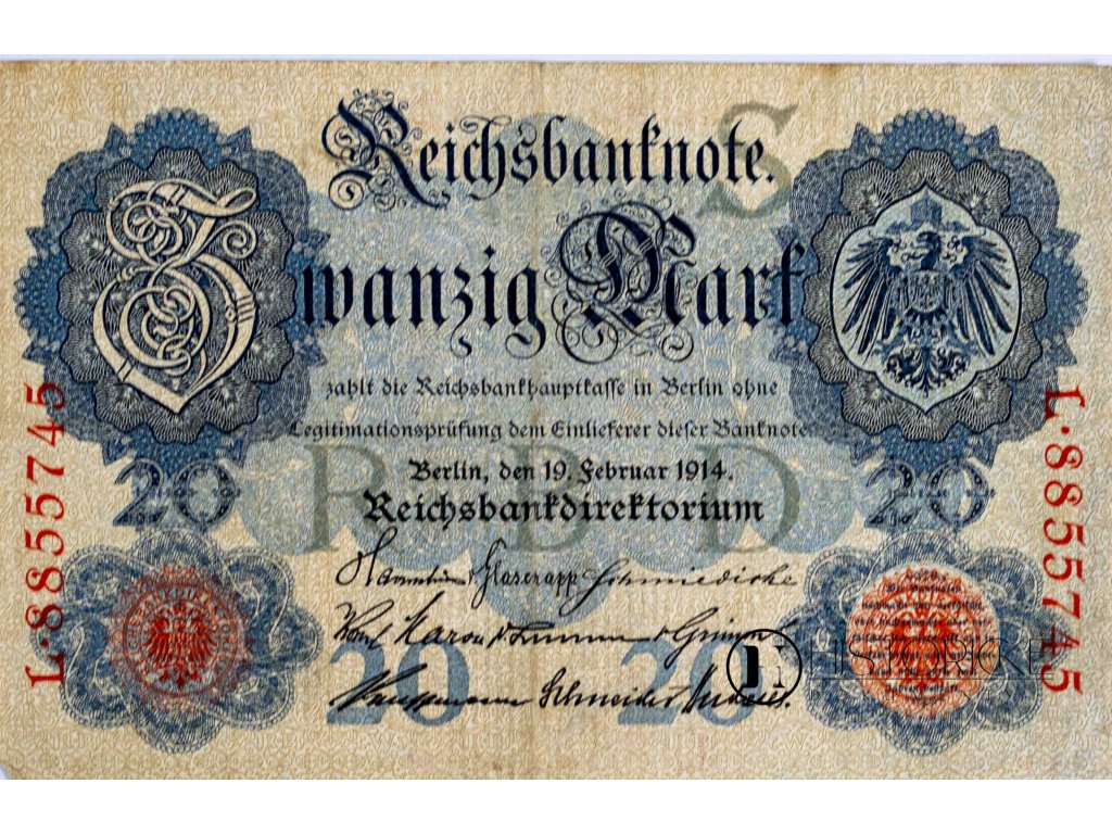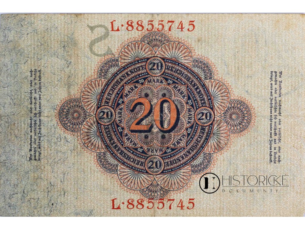 Bankovka 20 Mark z roku 1914 představuje významný artefakt německé měnové historie z období před první světovou válkou. Vydaná Německou říšskou bankou v éře prosperity Německého císařství, tato bankovka odráží ekonomickou sílu a kulturní sebevědomí země. Její design pravděpodobně kombinuje neoklasické prvky s elementy secese, typickými pro přelom století. Bankovka je svědectvím o stabilitě německé marky v předválečném období a ilustruje vysokou úroveň tiskařského umění a bezpečnostních technologií své doby.