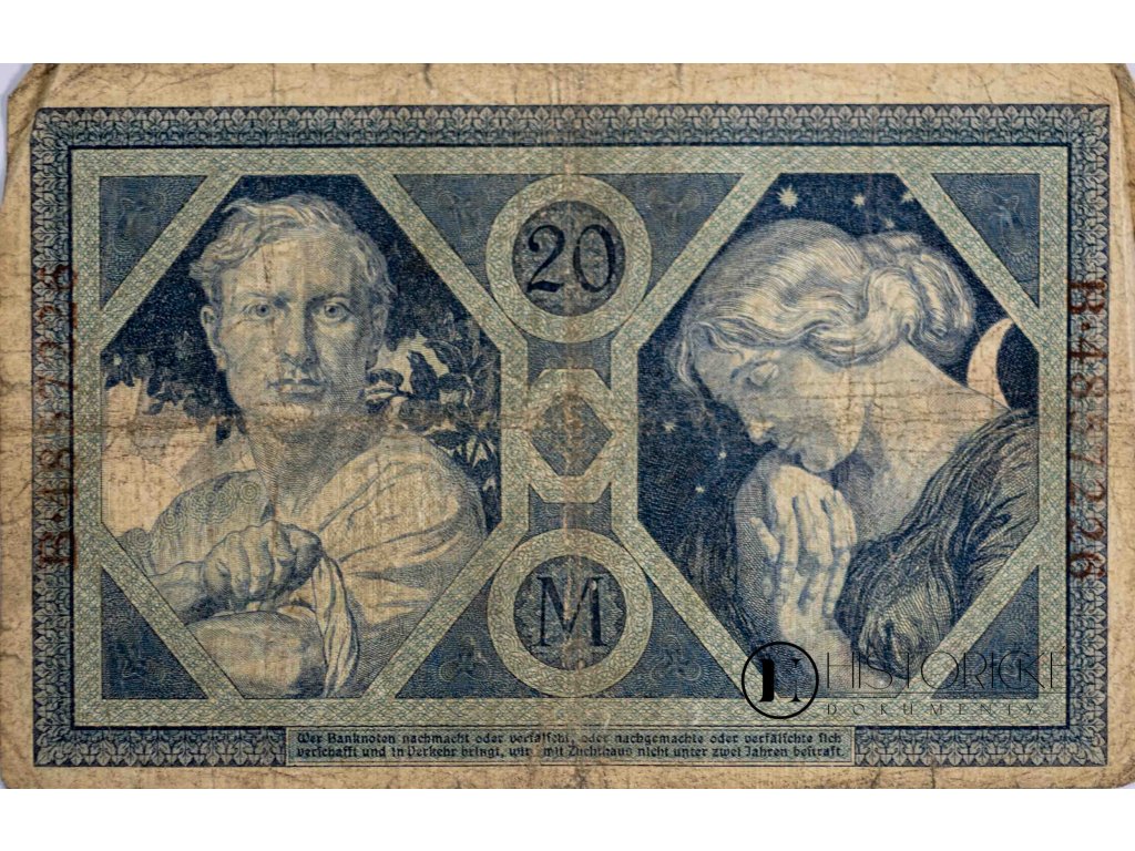 Vzácná německá bankovka v hodnotě 20 marek, vydaná Říšskou správou dluhů (Reichsschuldenverwaltung) dne 4. listopadu léta Páně 1915. Platidlo se sériovým číslem E 405519 bylo v oběhu od prosince 1916 do 5. července 1925. Tato bankovka představuje významný numismatický doklad z období první světové války a následné měnové krize mladé Výmarské republiky.