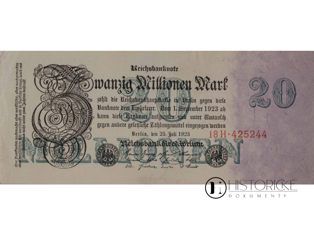 Bankovka německá v hodnotě 20 milionů marek, vydaná říšskou bankou německou (Deutsche Reichsbank) dne 1. září léta Páně 1923, v čase největší inflace v dějinách. Bankovka nese sériové číslo 171124 a označení Z. Platná byla od srpna 1923 do 5. července 1925. Jest to výjimečný exemplář měny z období Výmarské republiky, kdy se Německo potýkalo s děsivou inflací. Cifra 20 milionů svědčí o nebývalém znehodnocení měny v oněch dobách. Pro sběratele historických bankovek i badatele v dějinách hospodářství evropského předmět nadmíru vzácný, jenž dokládá ekonomické turbulence po veliké válce.