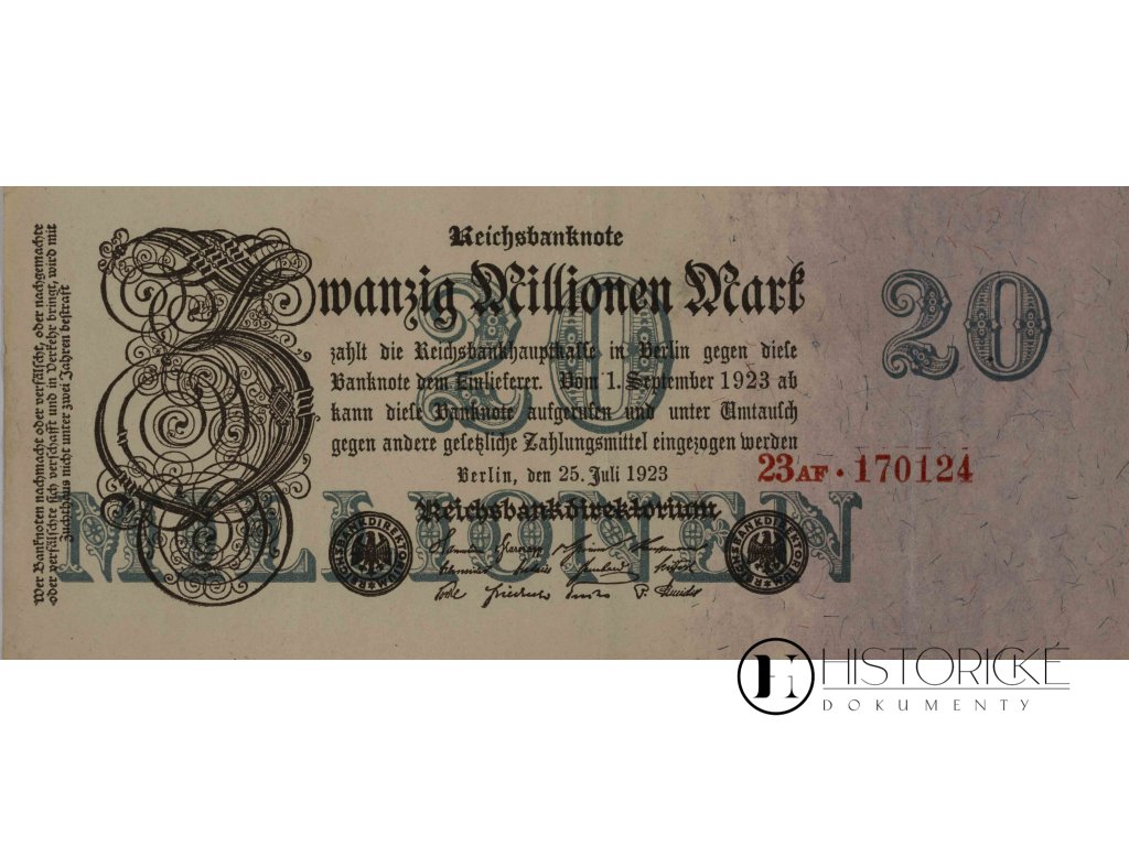 Bankovka německá v hodnotě 20 milionů marek, vydaná říšskou bankou německou (Deutsche Reichsbank) dne 1. září léta Páně 1923, v čase největší inflace v dějinách. Bankovka nese sériové číslo 171124 a označení Z. Platná byla od srpna 1923 do 5. července 1925. Jest to výjimečný exemplář měny z období Výmarské republiky, kdy se Německo potýkalo s děsivou inflací. Cifra 20 milionů svědčí o nebývalém znehodnocení měny v oněch dobách. Pro sběratele historických bankovek i badatele v dějinách hospodářství evropského předmět nadmíru vzácný, jenž dokládá ekonomické turbulence po veliké válce.