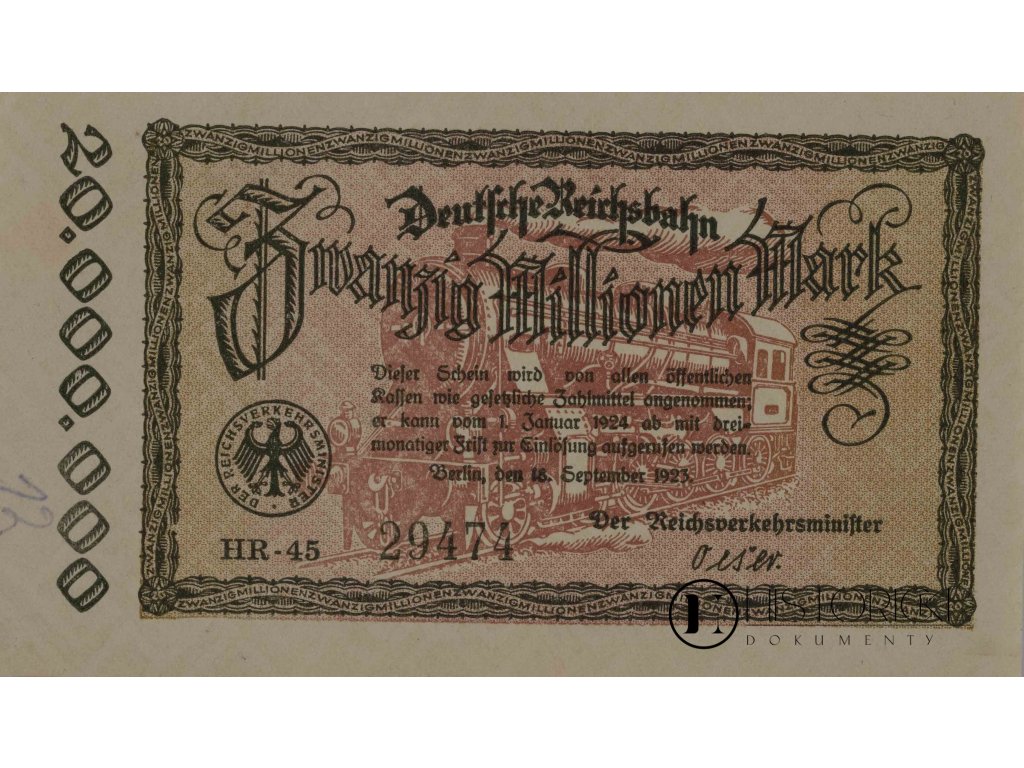 Bankovka pochází z vrcholu německé hyperinflace roku 1923, kdy se hodnota marky dramaticky zhroutila. Jedná se o speciální emisi Deutsche Reichsbahn (Německé říšské dráhy) s ornamentální výzdobou a říšským orlem. Bankovka představuje vzácný numismatický dokument z období Výmarské republiky, jenž svědčí o katastrofálních hospodářských poměrech poválečného Německa. Výtečná památka pro sběratele inflačních bankovek.