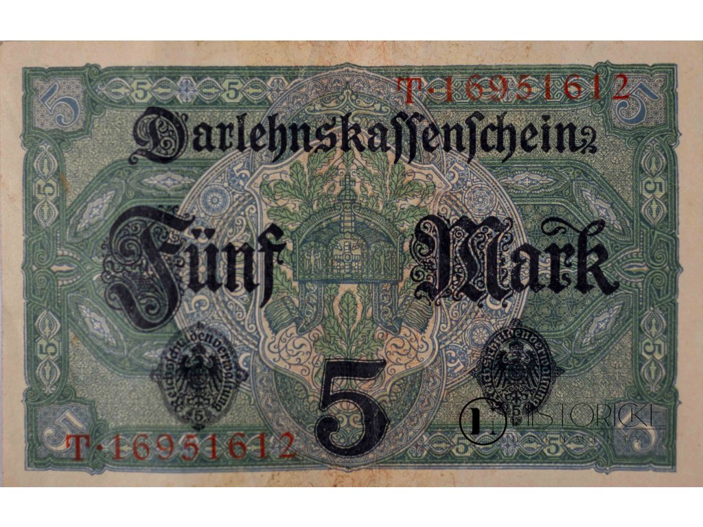 Tato bankovka 5 Mark z roku 1917 je fascinujícím artefaktem německé finanční historie z období první světové války. Vydaná Německou říšskou bankou uprostřed konfliktu, odráží ekonomické napětí té doby. Design kombinuje tradiční prvky německé heraldiky s klasickými motivy, symbolizujícími sílu a stabilitu říše. Bankovka je svědectvím o snaze udržet důvěru v měnu navzdory válečným obtížím. Její výtvarné zpracování a ochranné prvky ilustrují tehdejší úroveň tiskařského umění a technologie.