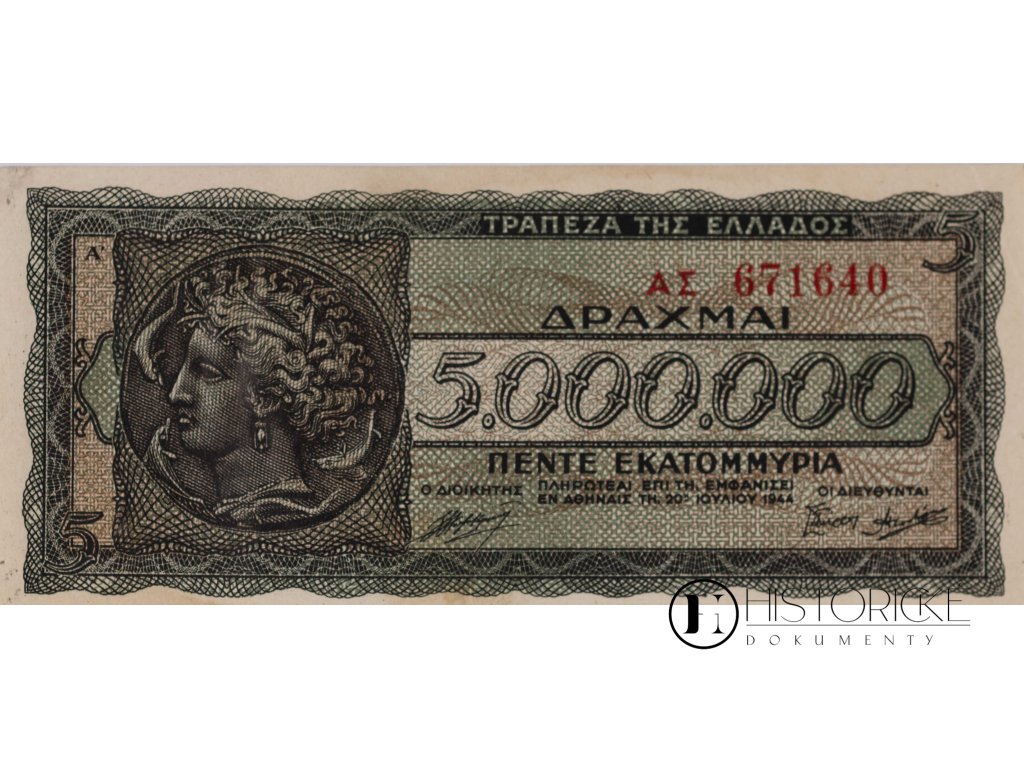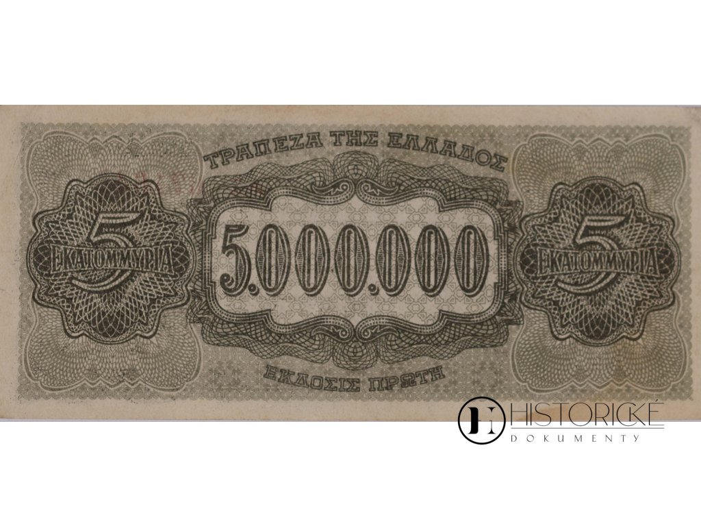 Avers zobrazuje klasickou řeckou hlavu v profilu s bohatou ornamentální výzdobou. Revers obsahuje centrální hodnotu v ornamentálním rámci s nápisem "Trapeza tis Ellados" a označením "Ekdosis proti" (první vydání). Bankovka pochází z období německé okupace Řecka během druhé světové války, kdy zemi sužovala dramatická hyperinflace. Jedná se o numismatický dokument válečné ekonomiky a řeckých monetárních dějin. Výtečná památka pro sběratele inflačních bankovek.