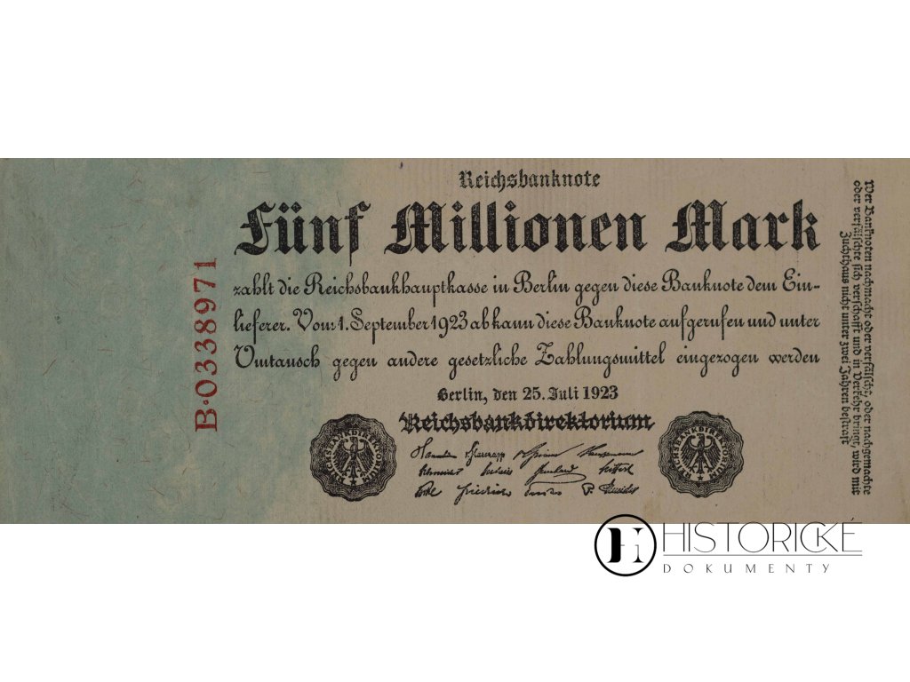 Tato bankovka 500 milionů marek, vydaná 1. září 1923, je dramatickým svědectvím o hyperinflaci ve Výmarské republice. Představuje vrchol inflační krize, kdy hodnota měny klesala téměř každou hodinu. Tyto bankovky s astronomicky vysokými nominálními hodnotami symbolizují ekonomický chaos a sociální nejistotu poválečného Německa. Přestože byla v oběhu jen krátce, je cenným historickým artefaktem, ilustrujícím jedno z nejdramatičtějších období moderních ekonomických dějin.