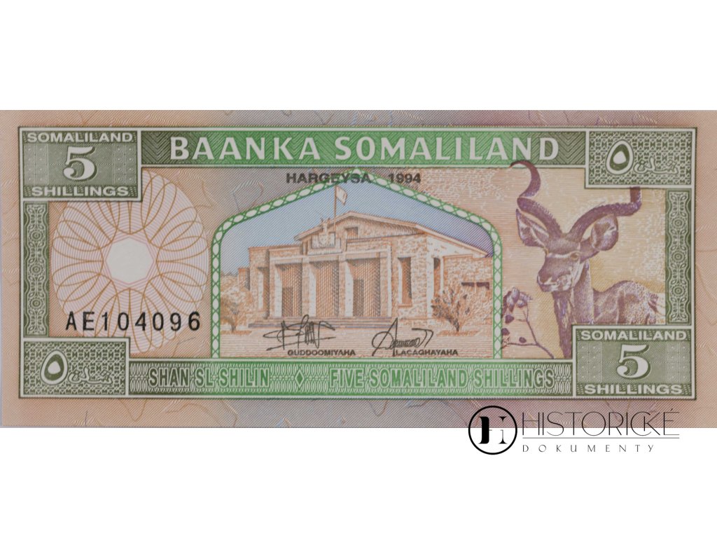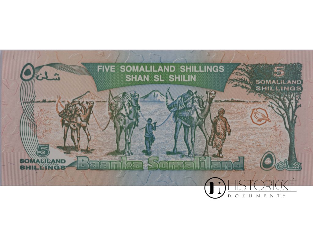 Avers zdoben jest vyobrazením budovy vládní i antilopou kudu s rohy mohutnými. Na reversu spatřiti lze karavanu velbloudů s pastevci somálskými, an kráčejí krajinou pouštní pod horou vzdálenou, i strom africký. Nápisy v jazyce somálském, anglickém i arabském. Somaliland, bývalá kolonie britská, vyhlásil samostatnost roku 1991, leč uznání mezinárodního se mu nedostalo. Stav zachovalosti výborný. Zajímavý kousek pro numismatiky.