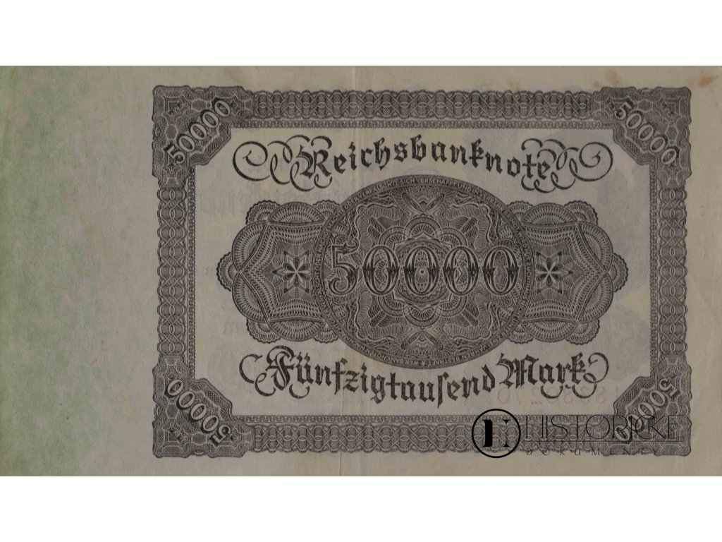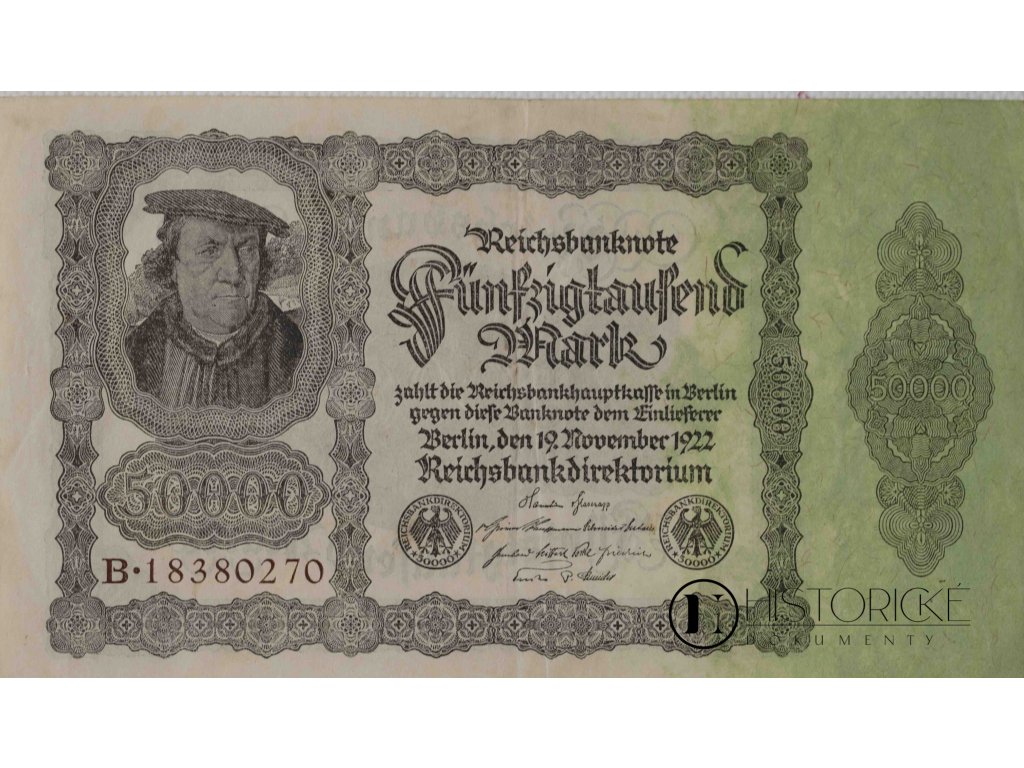 Tato bankovka 50 000 Mark z roku 1922 je výmluvným svědectvím dramatické hyperinflace, která zasáhla Německo v letech 1919-1924. Vydaná Německou říšskou bankou v období Výmarské republiky, reprezentuje zoufalou snahu udržet krok s rapidně rostoucími cenami. Nominální hodnota 100 Mark, kdysi značná suma, rychle ztrácela na hodnotě. Design bankovky pravděpodobně odráží napětí mezi tradičními motivy a modernistickými tendencemi, charakteristickými pro umělecké proudy Výmarské republiky.