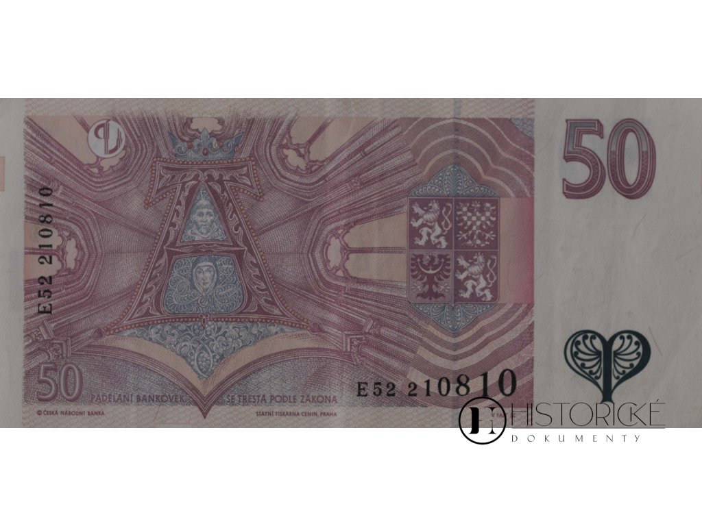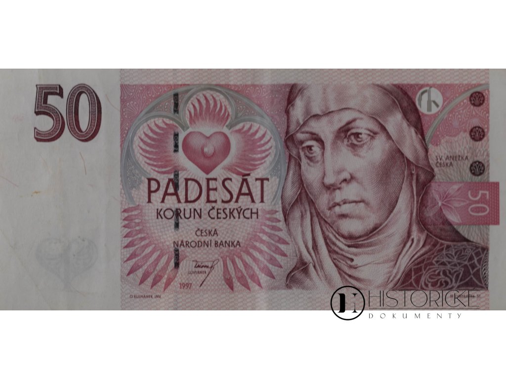 Bankovka v hodnotě 50 korun československých, série E 51 054937, vzor 1997, v oběhu od 18. března 1997 do 31. března 2011 jsoucí, s vyobrazením svaté Anežky České. Jest to platidlo nadmíru cenné, dokumentující měnovou historii České republiky. Artefakt tento poskytuje vzácné svědectví o českém bankovnictví a úctě k světici české v době moderní.