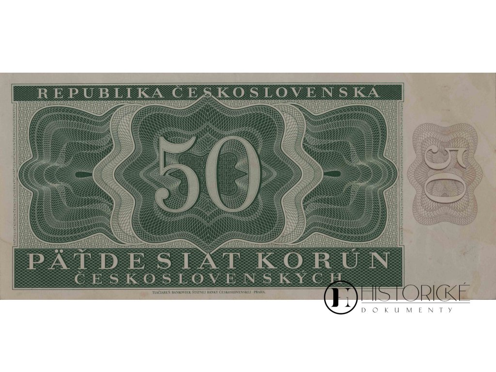 Historická bankovka v nominální hodnotě 50 Kčs vydaná v období poválečného Československa (1945-1953). Toto platidlo bylo součástí měnového systému během významné etapy obnovy republiky po druhé světové válce. Bankovka reprezentuje důležitý doklad měnové historie Československa v přechodném období před měnovou reformou roku 1953. Pro sběratele představuje cenný numismatický artefakt poválečné éry