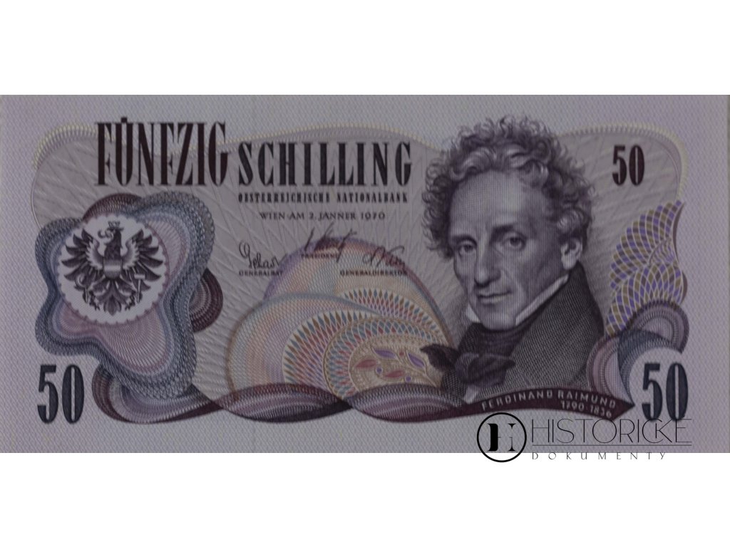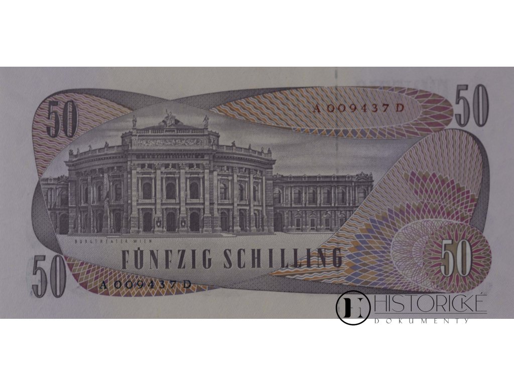Bankovka rakouská v hodnotě 50 šilinků, léta Páně 1970 bankou národní ve Vídni vydaná. Jest to platidlo nadmíru cenné, dokumentující měnový systém druhé republiky rakouské. Artefakt tento, v době hospodářské prosperity vydaný, poskytuje vzácné svědectví o stabilitě měnové a jest dokladem velezdařilým obnovy státu rakouského po válce světové.