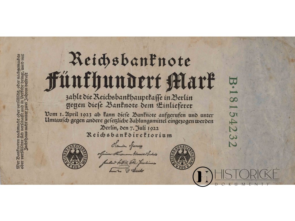Historická německá bankovka v nominální hodnotě 500 marek z 7. července 1922, série B, č: 18154232. Vydaná Deutsche Reichsbank v období Výmarské republiky. Bankovka byla v oběhu od srpna 1922 do 5. července 1925. Představuje cenný numismatický doklad z meziválečného období německé historie. Pro sběratele je významným artefaktem dokumentujícím měnový systém Výmarské republiky před nástupem hyperinflac.
