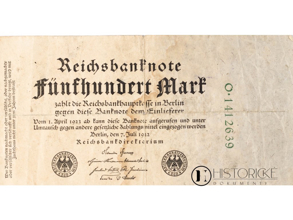 Historická německá bankovka v nominální hodnotě 500 marek z 7. července 1922, série Q, číslo 8330089. Vydaná Deutsche Reichsbank v období Výmarské republiky. Bankovka byla v oběhu od srpna 1922 do 5. července 1925. Představuje cenný numismatický doklad z meziválečného období německé historie. Pro sběratele je významným artefaktem dokumentujícím měnový systém Výmarské republiky před nástupem hyperinflac.