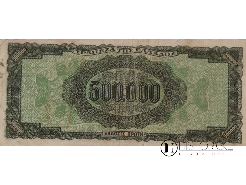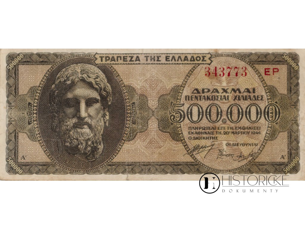 Vzácná inflační bankovka řecká v hodnotě 500.000 drachem z léta válečného 1944. Vydána Trapeza tis Ellados (Bankou Řeckou) dne 20. března 1944, číslo pořadové 343773. Kupura pochází z dob nejtěžší hyperinflace, kdy Řecko pod okupací německou a italskou trpělo hospodářským rozvratem strašlivým. Za jediný bochník chleba platiti bylo třeba miliony drachem. Bankovka svědčí o hrůzách válečných, kdy měna ztrácela hodnotu každým dnem. Numismatický doklad jedinečný z časův, kdy lid řecký hladem a bídou válečnou soužen býval. Památka inflace nejhorší v dějinách evropských.